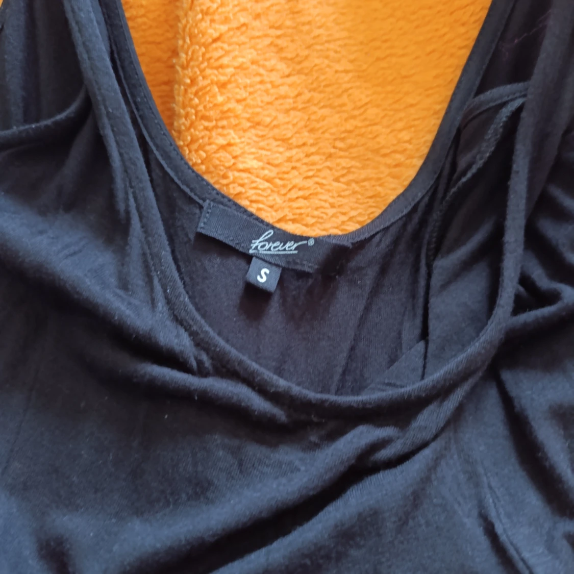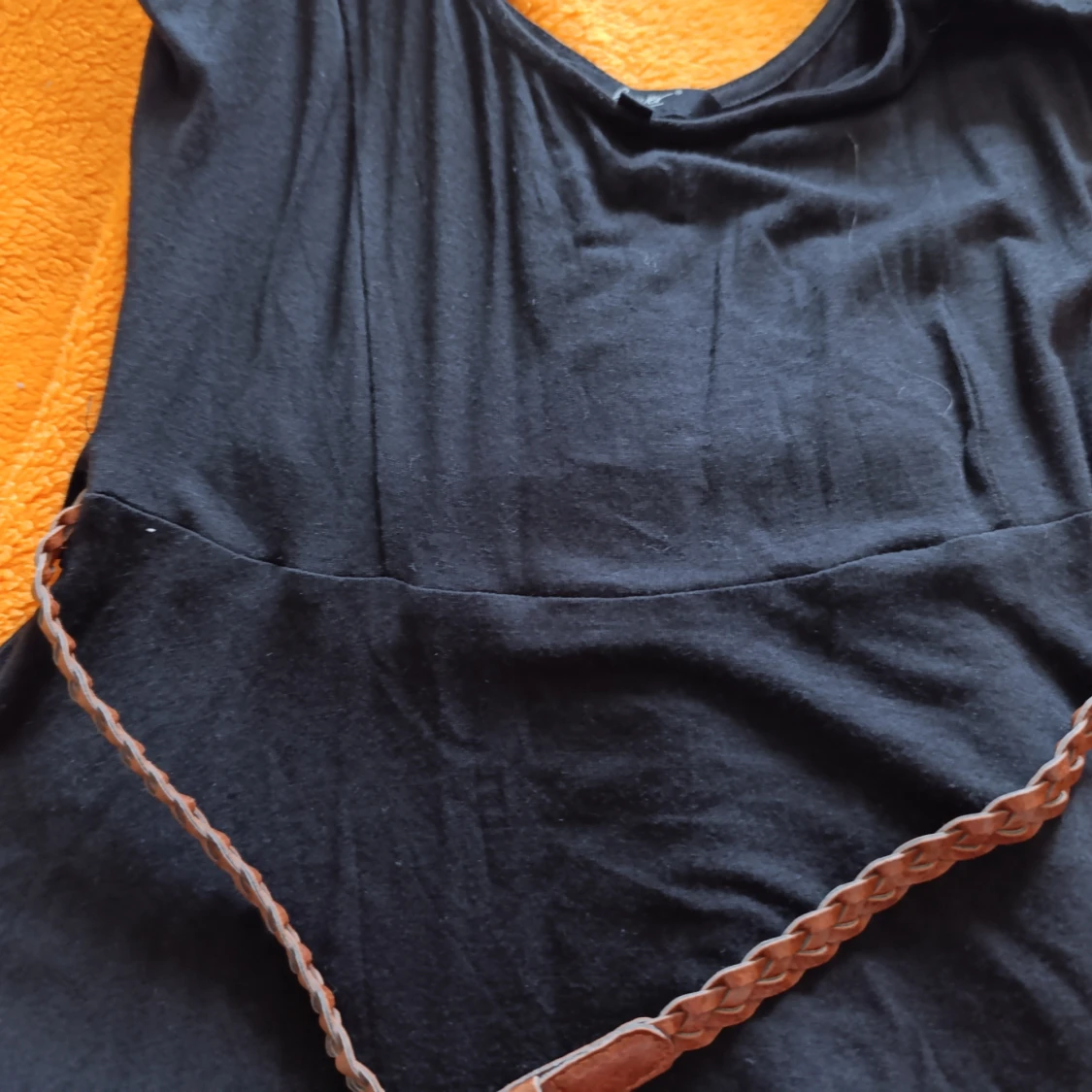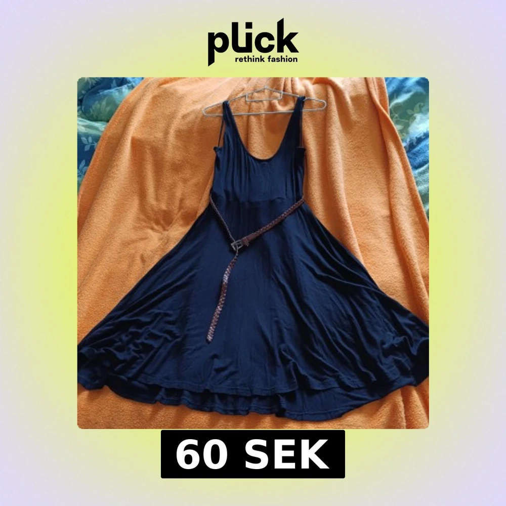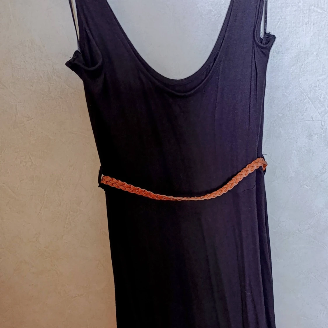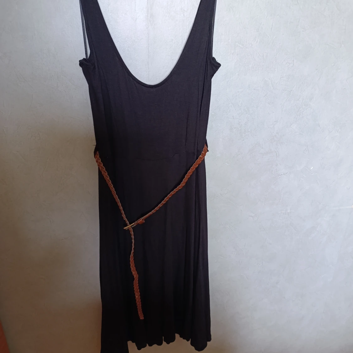 Enkel och snygg svart klänning med djup urringning både fram och bak. Klänningen har ett brunt flätat bälte i midjan som ger en cool kontrast. Tillverkad i ett mjukt och lätt tyg, perfekt för varma dagar eller när du vill känna dig extra fri.