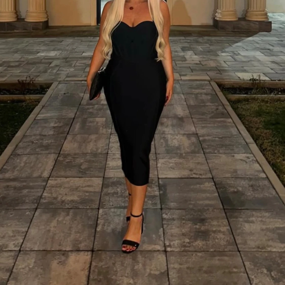 Säljer en elegant svart korsettklänning design och figurnära passform. Klänningen har en stilren och tidlös look som passar perfekt till speciella tillfällen. Materialet känns mjukt och följsamt mot kroppen.