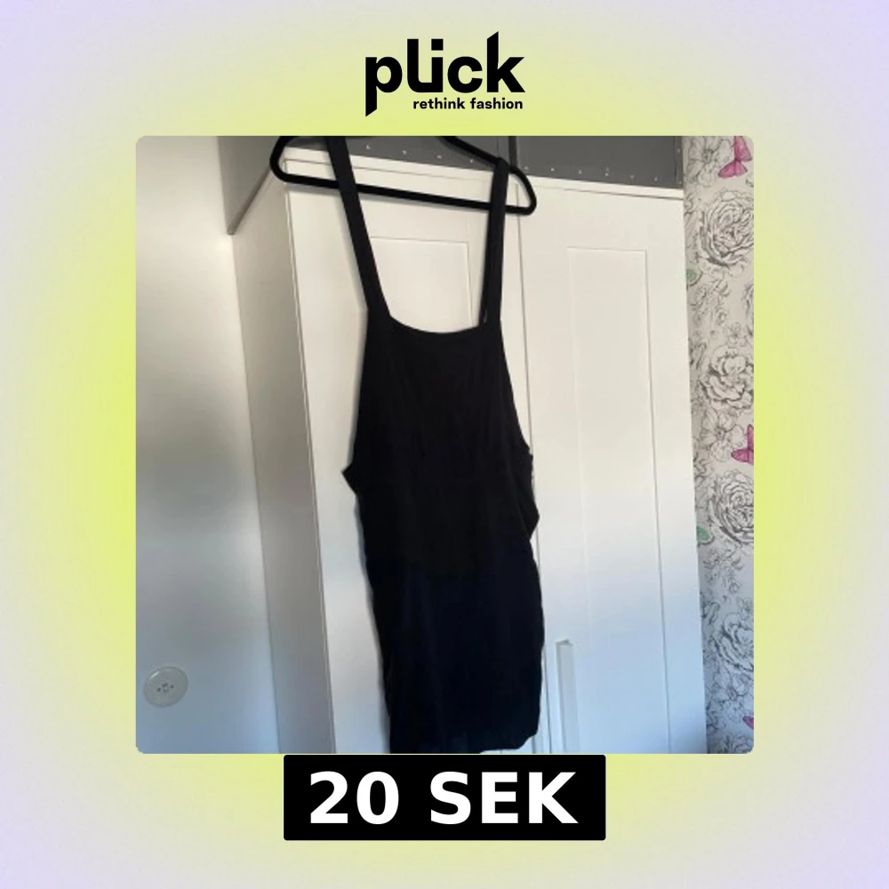 Svart kort klänning med breda axelband och en cool ficka med dragkedja på sidan. Klänningen har en enkel, loose passform och är tillverkad i mjuk bomull. Klänningen har gått upp i några sömmar men lätt att laga, där av billigt pris. Storlek 42 men passar 38 bäst.