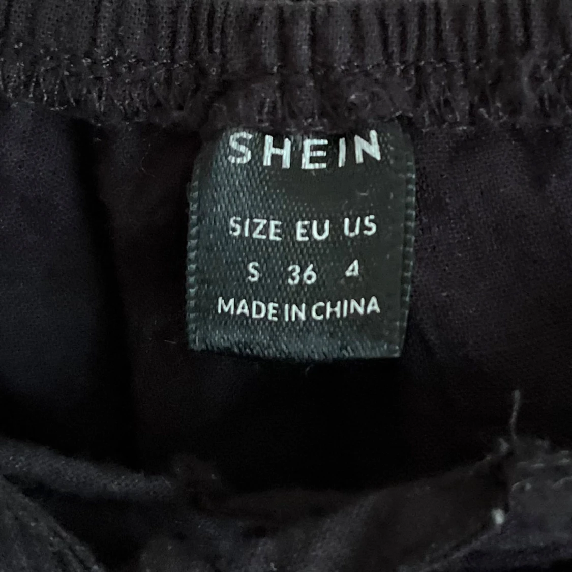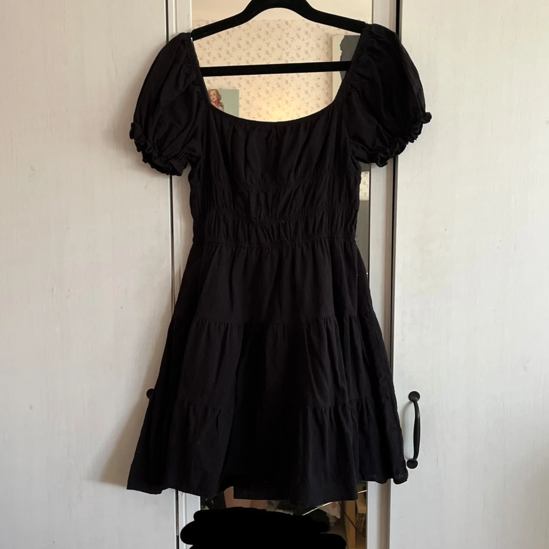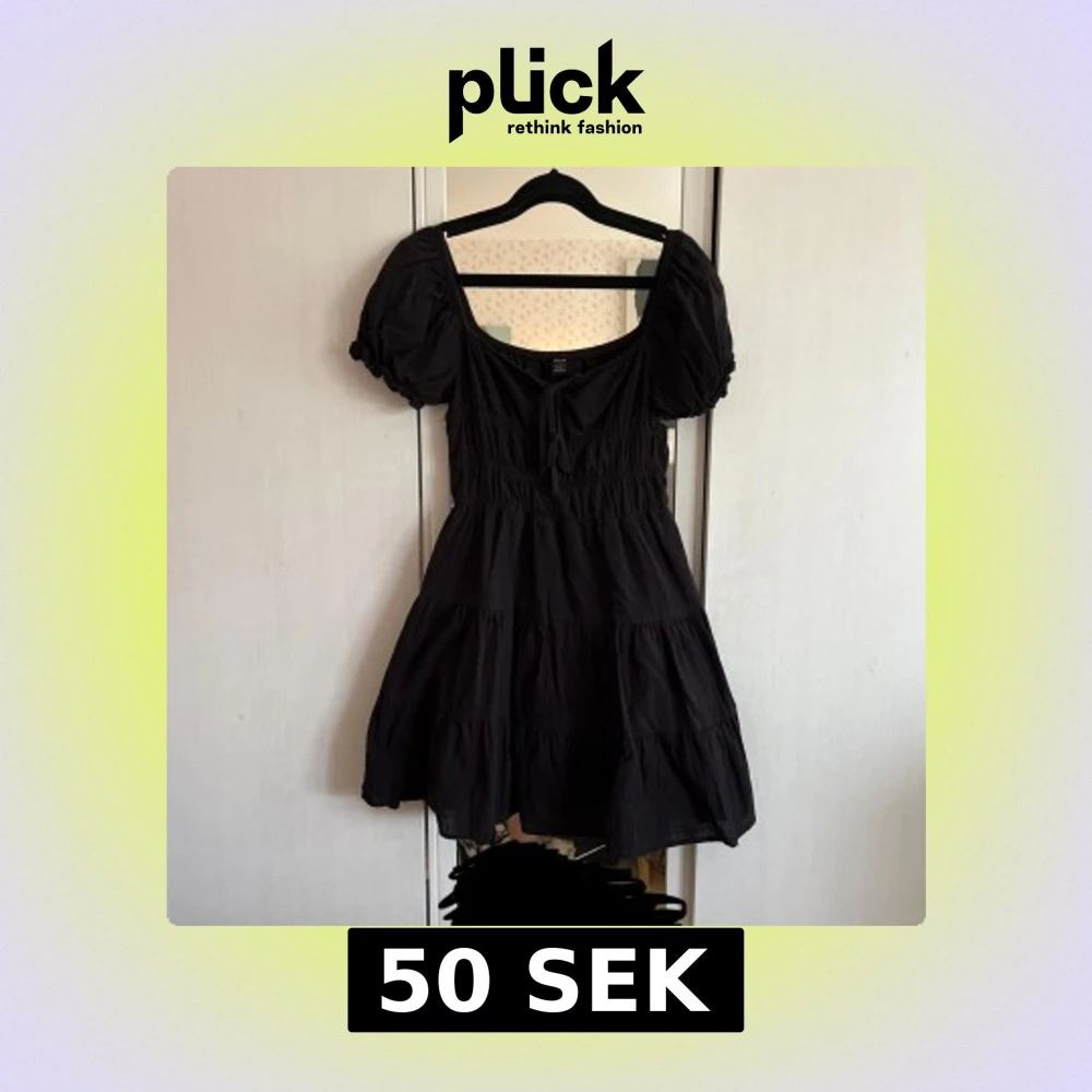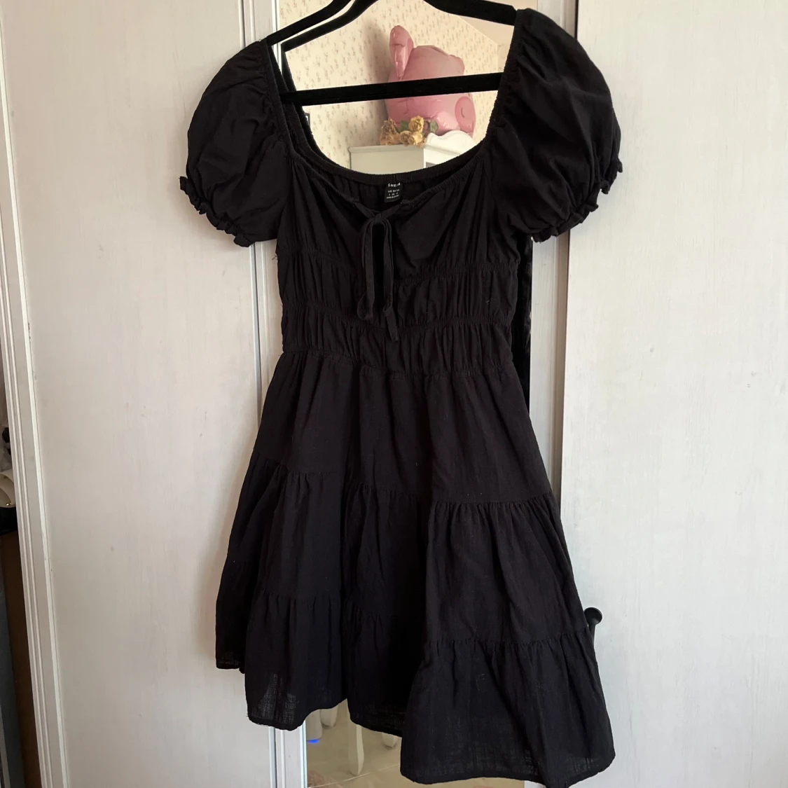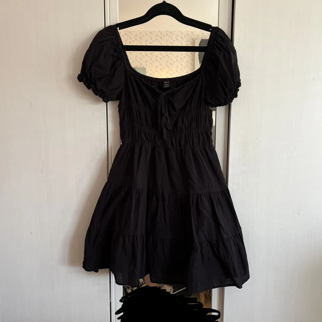 Supersöt svart klänning från SHEIN i strl S med puffärmar och volanger. Modellen har en rundad urringning med knytning framtill!💞