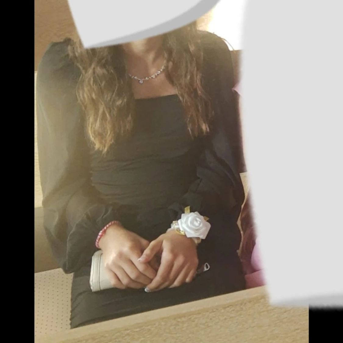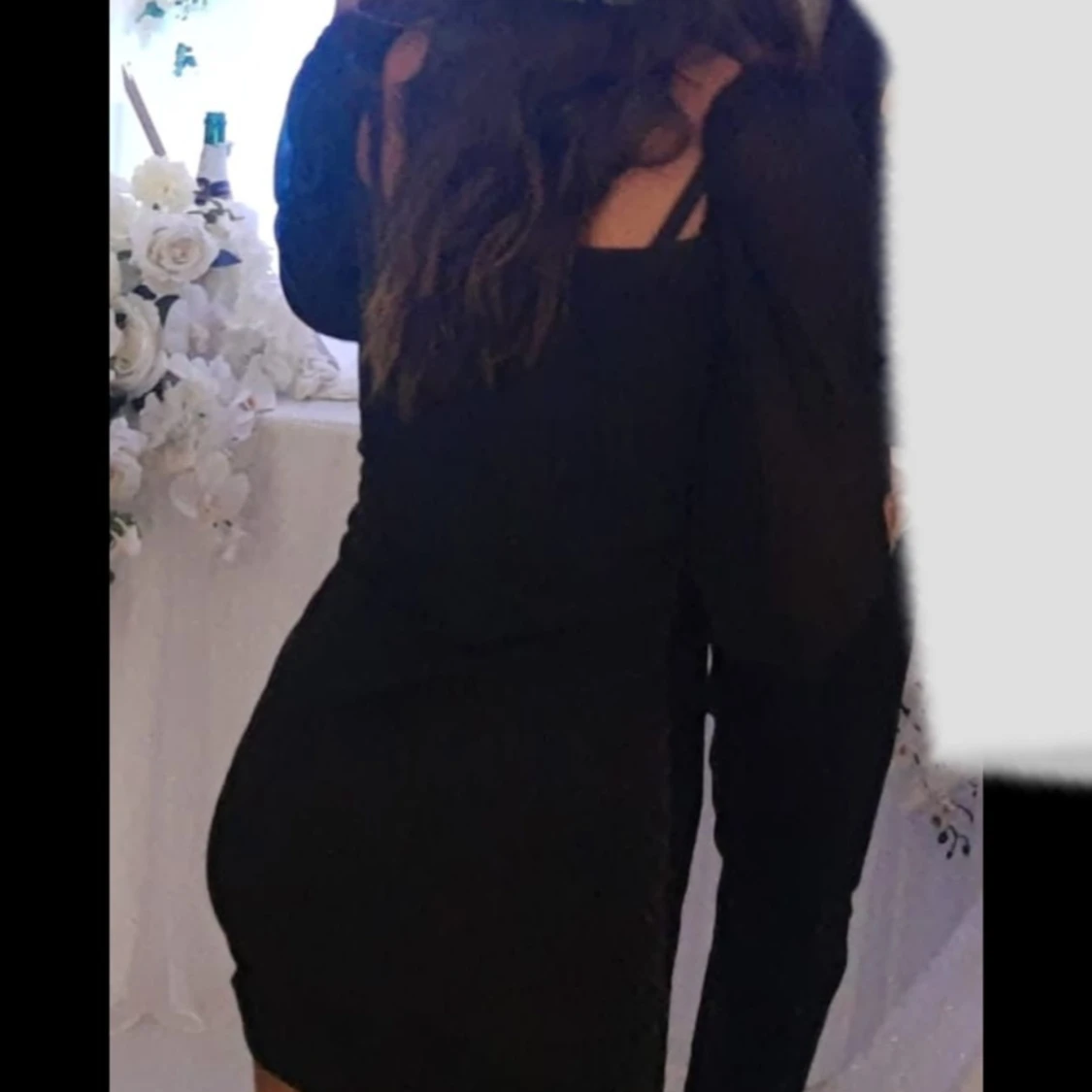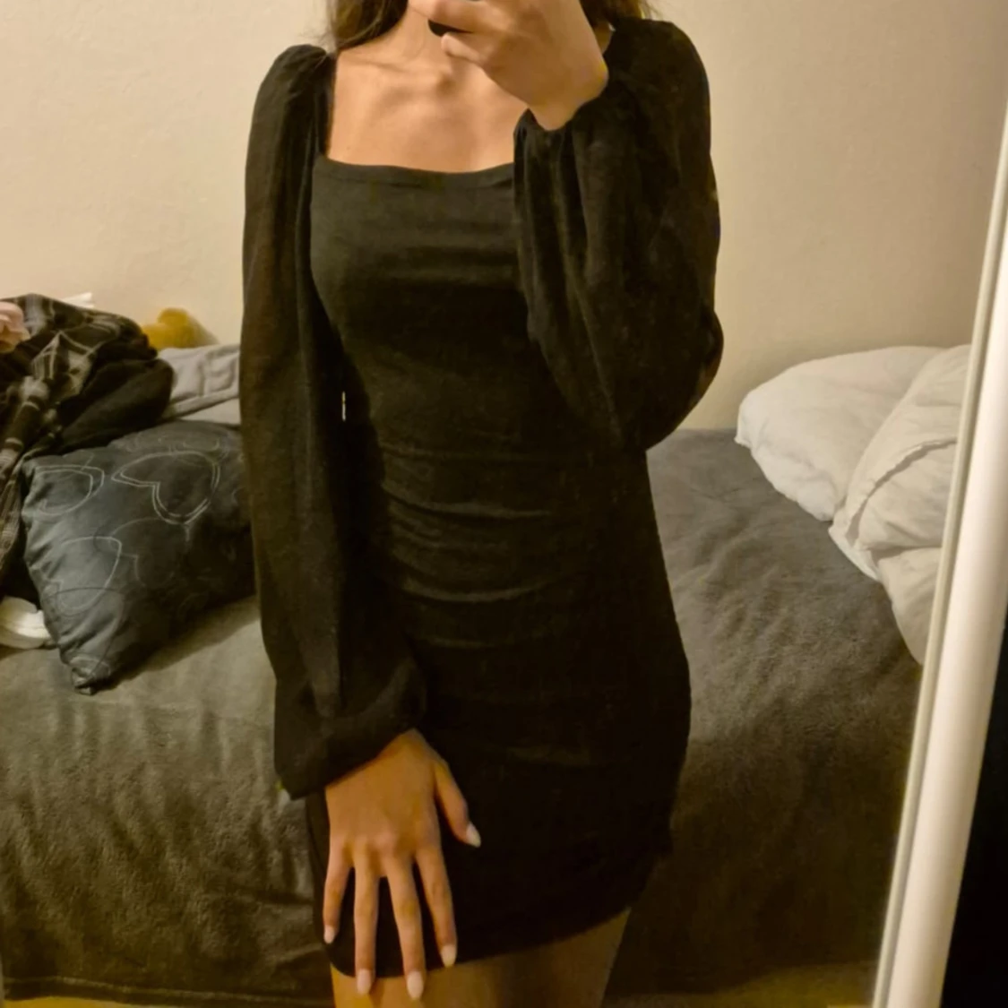 Säljer en svart kort klänning med långa, transparenta puffärmar och fyrkantig urringning. Klänningen har en tight passform och är perfekt för dig som gillar en stilren och trendig look. Materialet är mjukt och följsamt, vilket gör den superbekväm att bära. Endast använd en gång på ett bröllop.