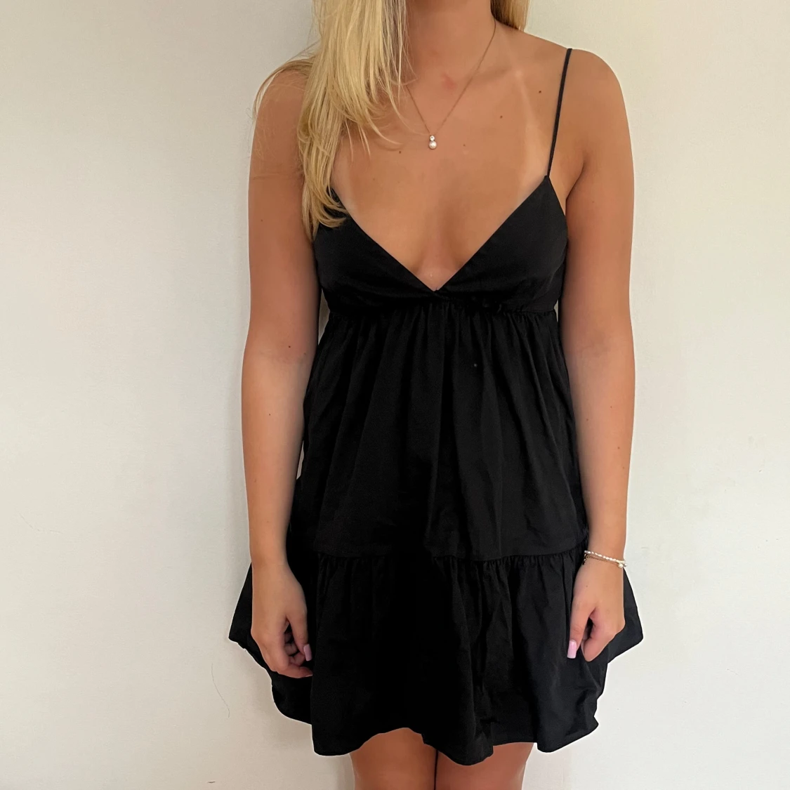 Säljer en svart kort klänning med smala axelband och djup v-ringning. Klänningen har en luftig passform med volang nedtill. Tyvärr så är alla lappar på klänningen borta men jag tror att den är i en storlek xs/s och att den är från Zara.