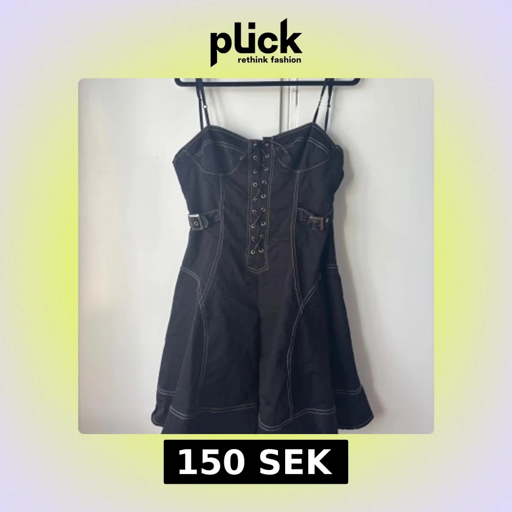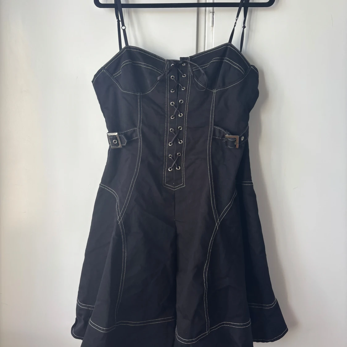 Svart kort klänning med smala axelband, markerade sömmar och snörning framtill. Klänningen har coola bältesdetaljer i midjan och en lätt utsvängd kjol. Perfekt för dig som gillar edgy och unik stil. Hör av dig om du vill ha fler bilder eller har några frågor!