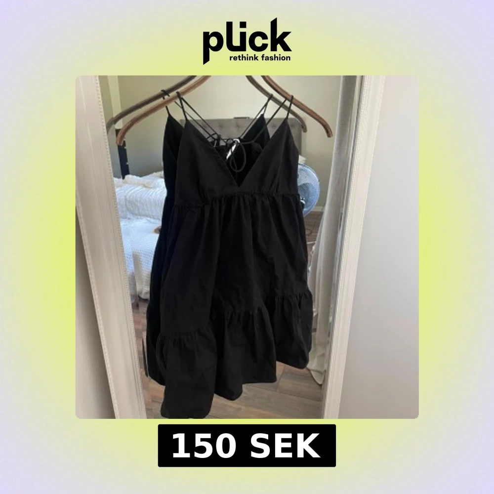 Säljer en svart kort klänning från Zara med volanger och tunna axelband som korsas och knyts i ryggen. Klänningen har en v-ringad front och är tillverkad i ett mjukt bomullstyg. Perfekt för dig som gillar en luftig och trendig look med snygga detaljer.