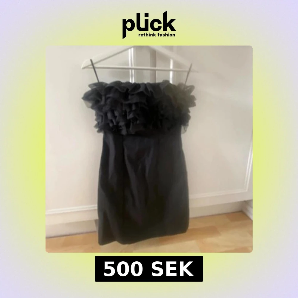 Supersnygg svart kort klänning med axelbandslös design och flera lager volanger upptill. Klänningen har en rak passform och är perfekt för dig som vill sticka ut. Materialet känns lätt och har en elegant struktur.