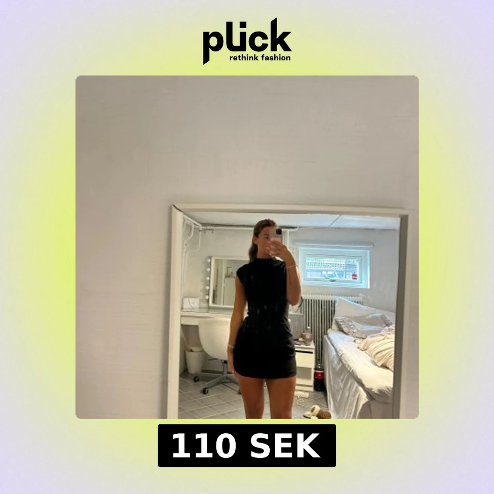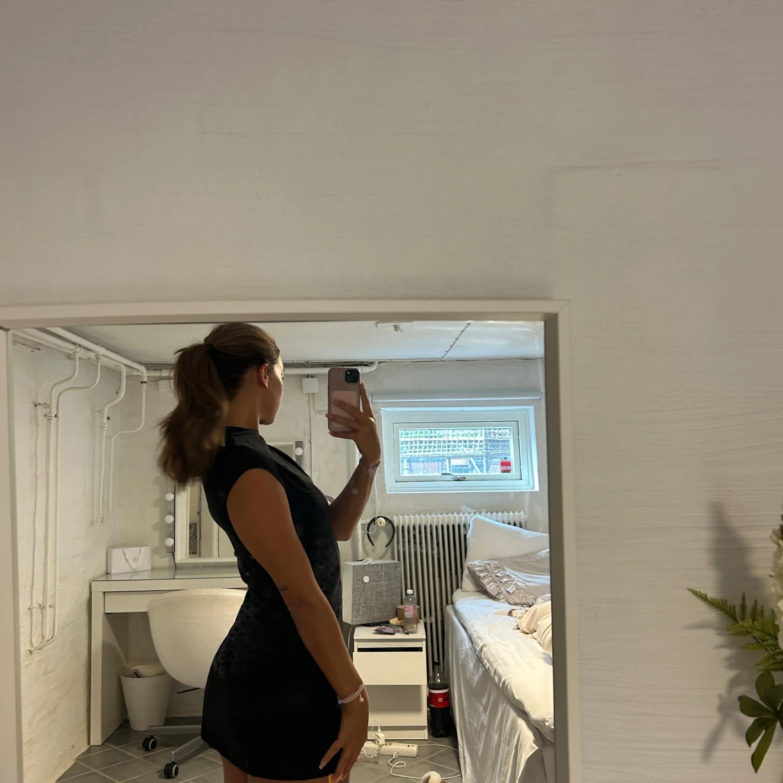 Säljer en svart, kort och figurnära klänning med hög hals och korta ärmar. Klänningen har en stilren och enkel design utan synliga detaljer eller mönster, perfekt för dig som gillar minimalistisk stil.