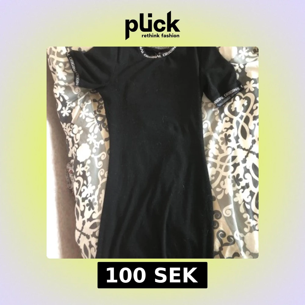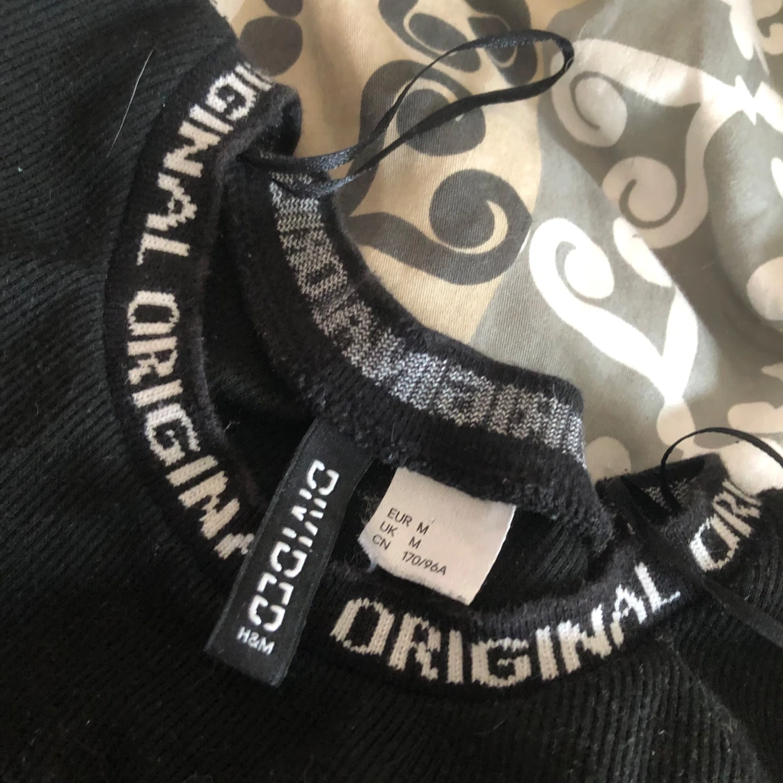 Svart kortklänning från H&M med texten 'ORIGINAL' i vitt runt halsringning och ärmslut. Klänningen har en enkel, tight passform och är tillverkad i mjukt, stretchigt material. .