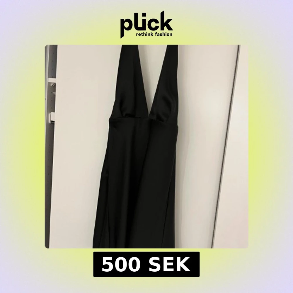 Snygg svart långklänning i satinliknande material med djup v-ringning och öppen rygg. Klänningen har en diskret dragkedja bak för enkel påklädning. Perfekt för dig som vill sticka ut med en elegant och stilren look. Sista bilden är hur den sitter på fast att klänningen som säljs är svart med glansigt material.