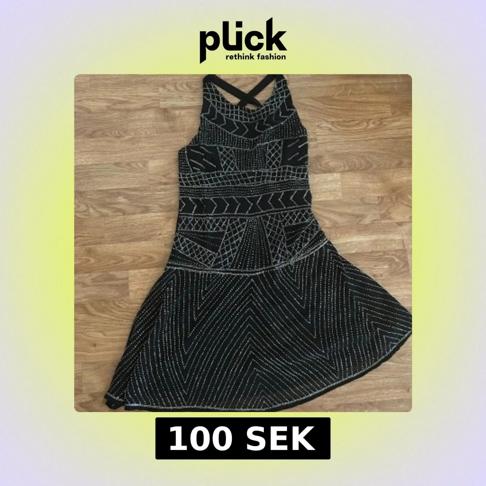Svart kortklänning från Glamorous i storlek S. Klänningen har silvriga glittriga mönster, korsade axelband i ryggen och en figurnära överdel med utsvängd kjol. Perfekt för dig som vill sticka ut med coola detaljer och snygg passform.