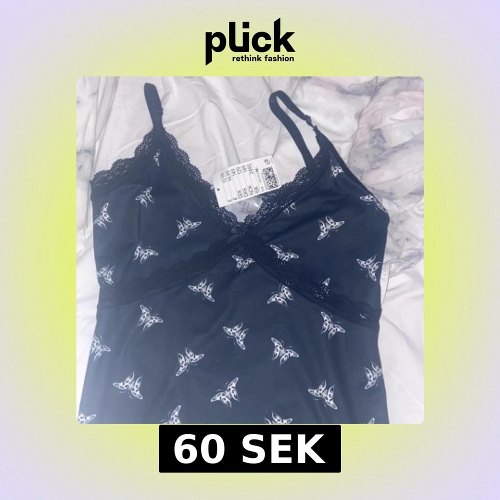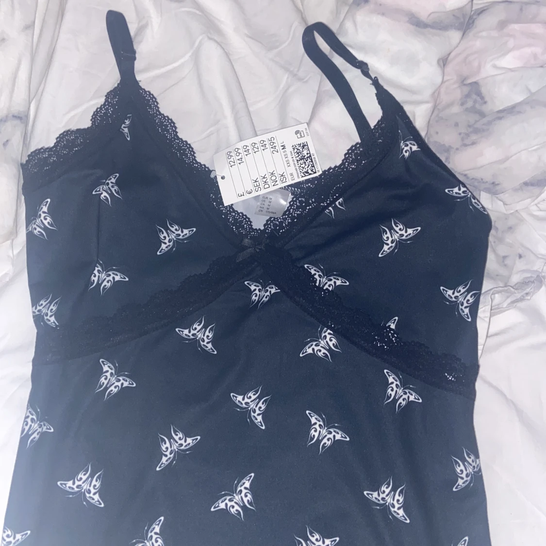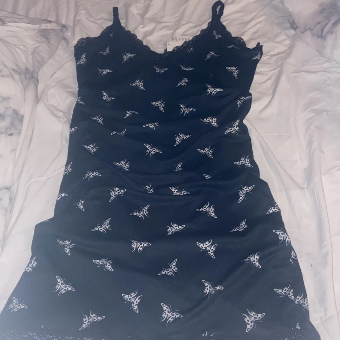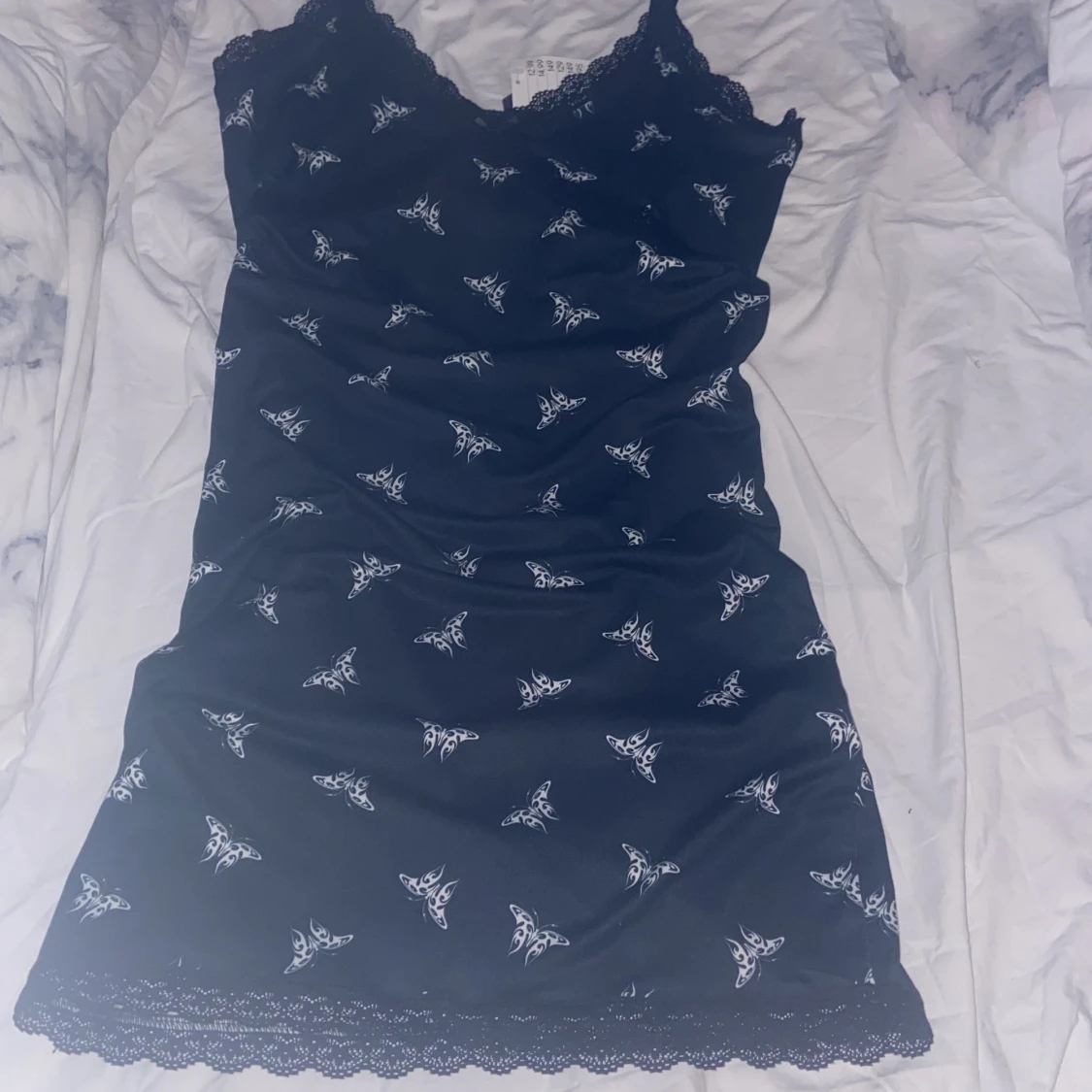 Svart kortklänning med vita fjärilar och spets. Klänningen har smala axelband och en feminin, figurnära passform. Perfekt för dig som gillar en söt och trendig stil.