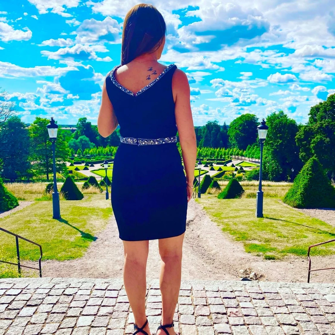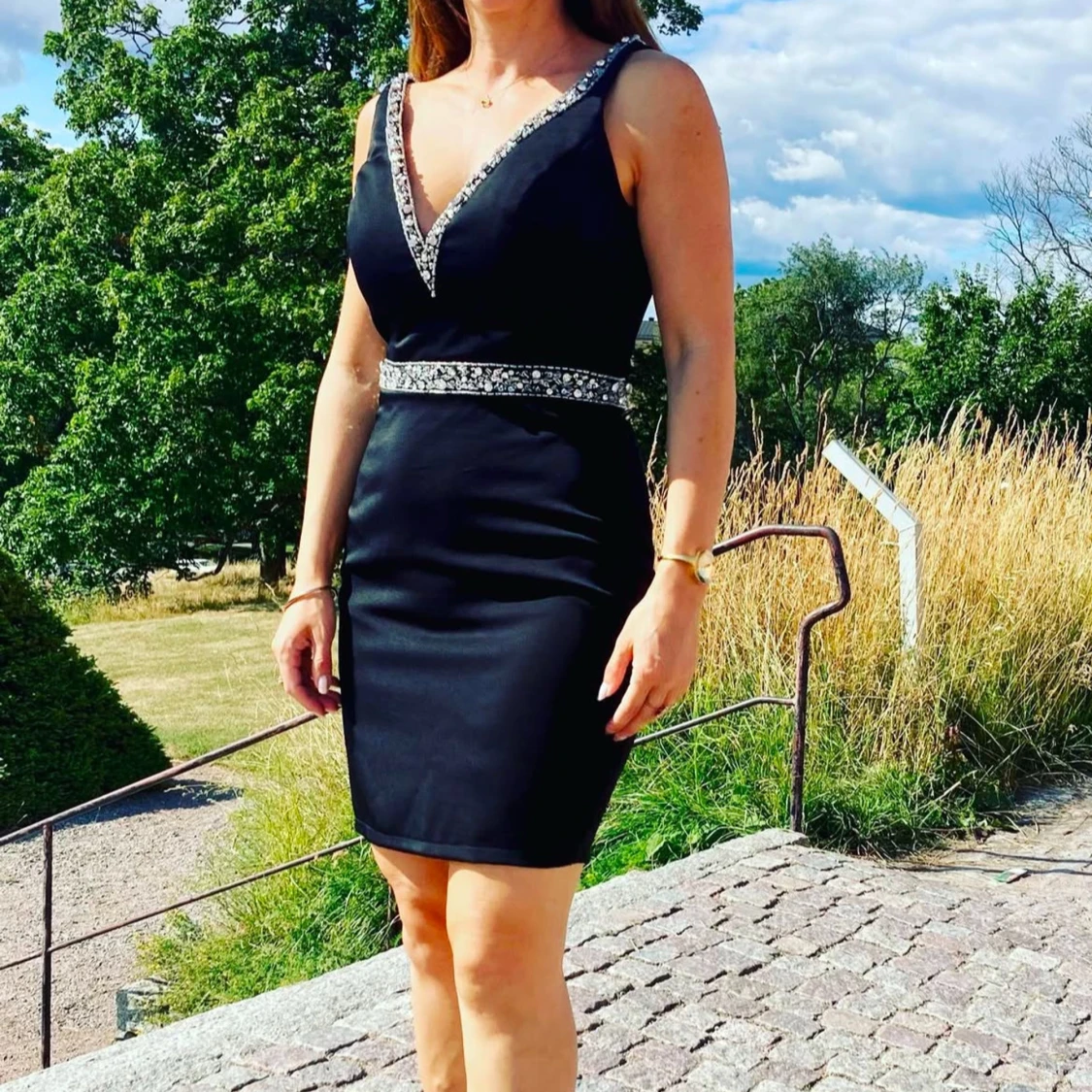 Säljer en svart kortklänning med v-ringning och glittriga detaljer längs urringning och midja. Klänningen har breda axelband och en figurnära passform som framhäver siluetten. Perfekt för festliga tillfällen!