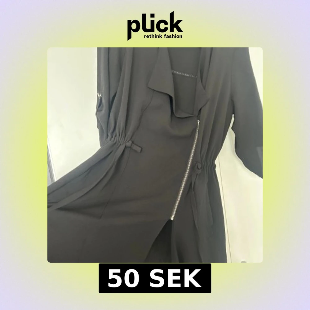 Svart lång kofta asymmetrisk dragkedja och knyt i midjan. Klänningen har trekvartsärmar med knappdetalj och en snygg, lös passform. Materialet känns lätt och flowy, perfekt för dig som gillar stilrena och moderna plagg.