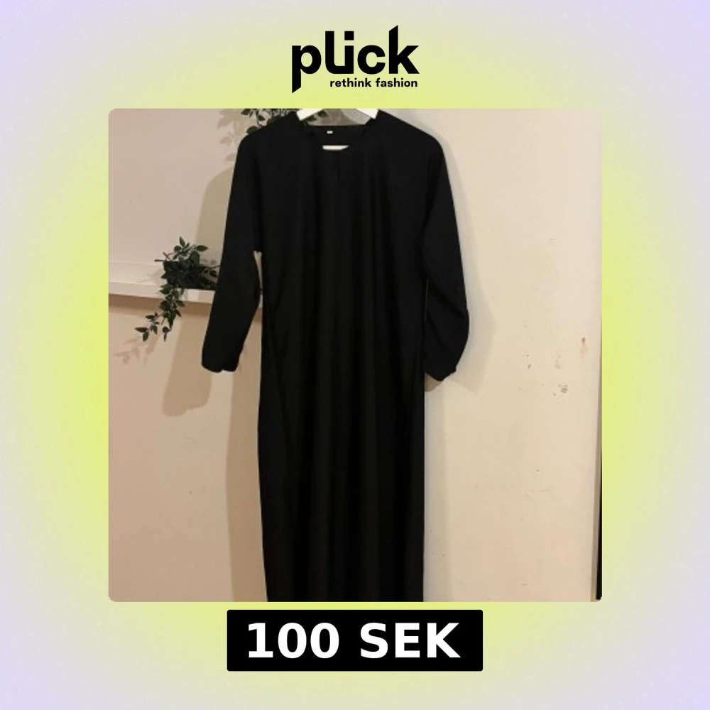 En stilren svart lång abaya med raka linjer och lång ärm. Klänningen har en enkel rund halsringning med liten slits framtill och är helt enfärgad utan mönster. Passformen är rak och loose, vilket ger en avslappnad och modern look.