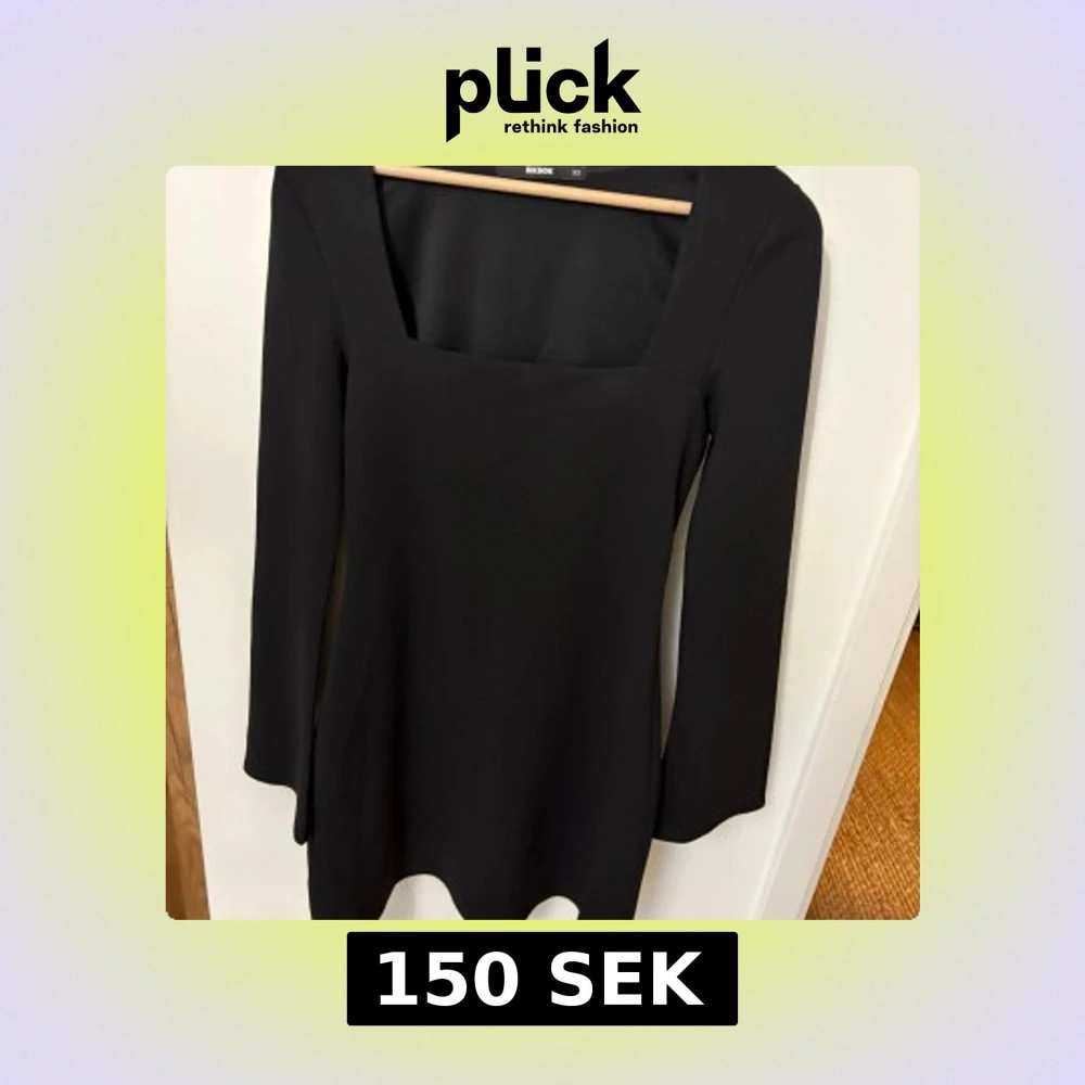 En stilren svart klänning från BikBok i storlek XS. Klänningen har lång ärm och fyrkantig ringning, vilket ger en modern och enkel look. Perfekt att styla med smycken eller boots för en trendig outfit.