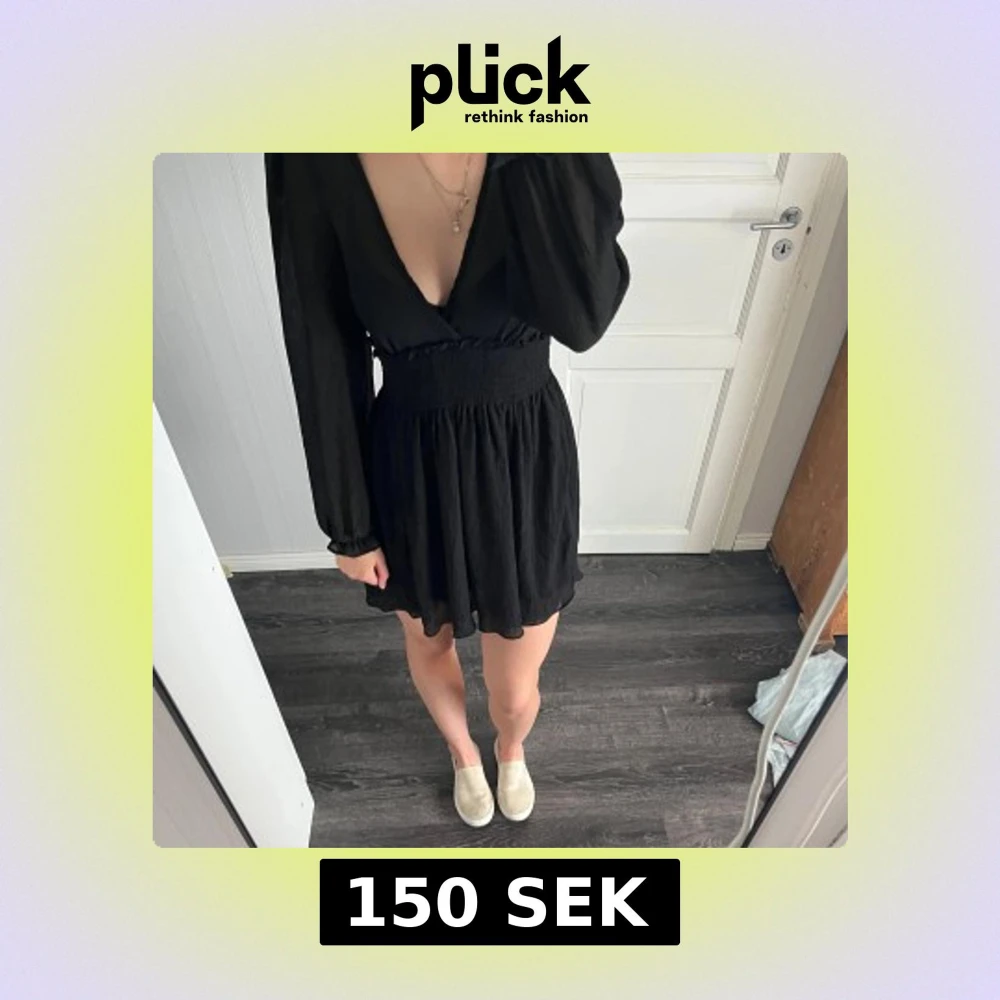 Svart kortklänning med lång ärm och djup v-rigning. Klänning är från NAKD använd typ 1 gång så jätte bra skick! 🤗
