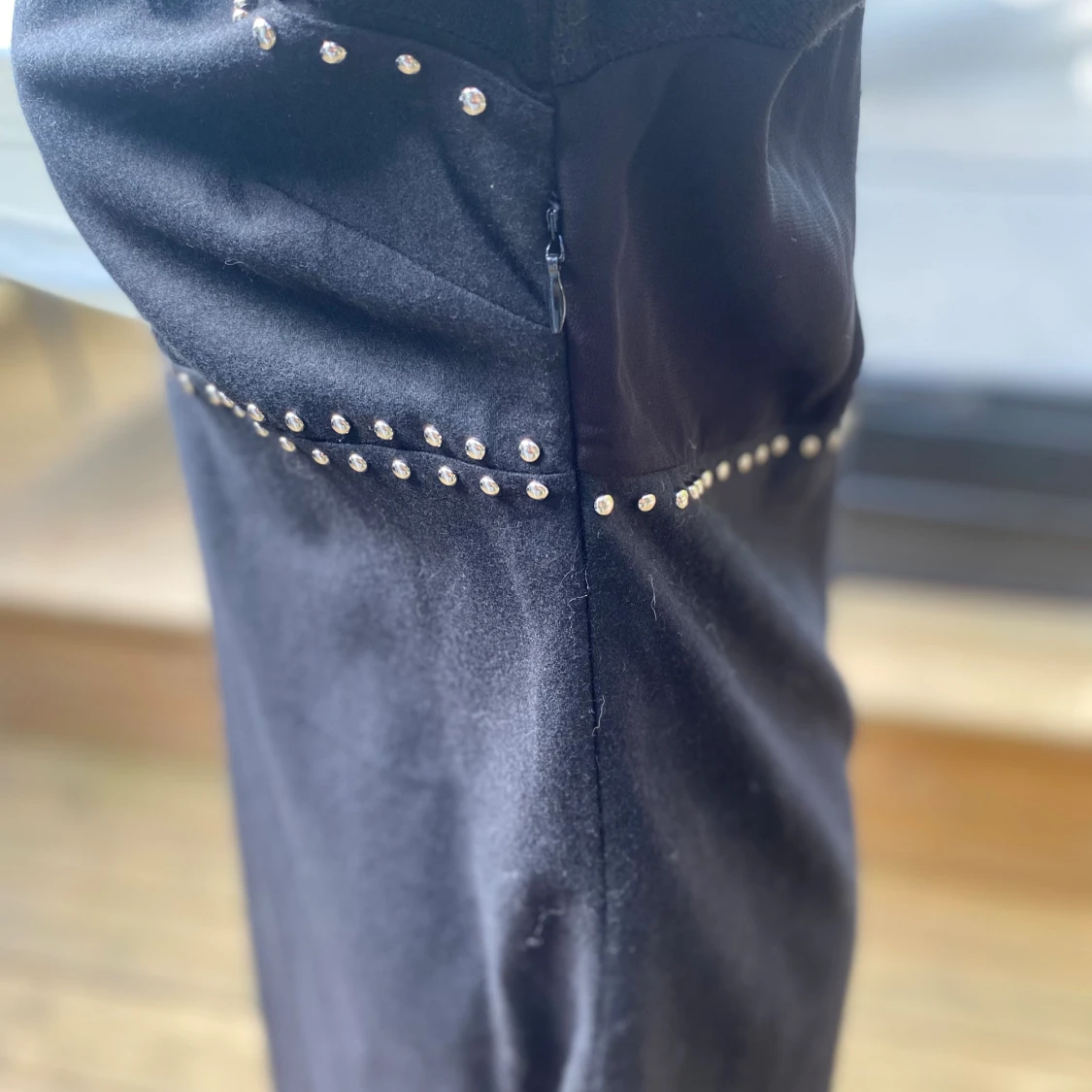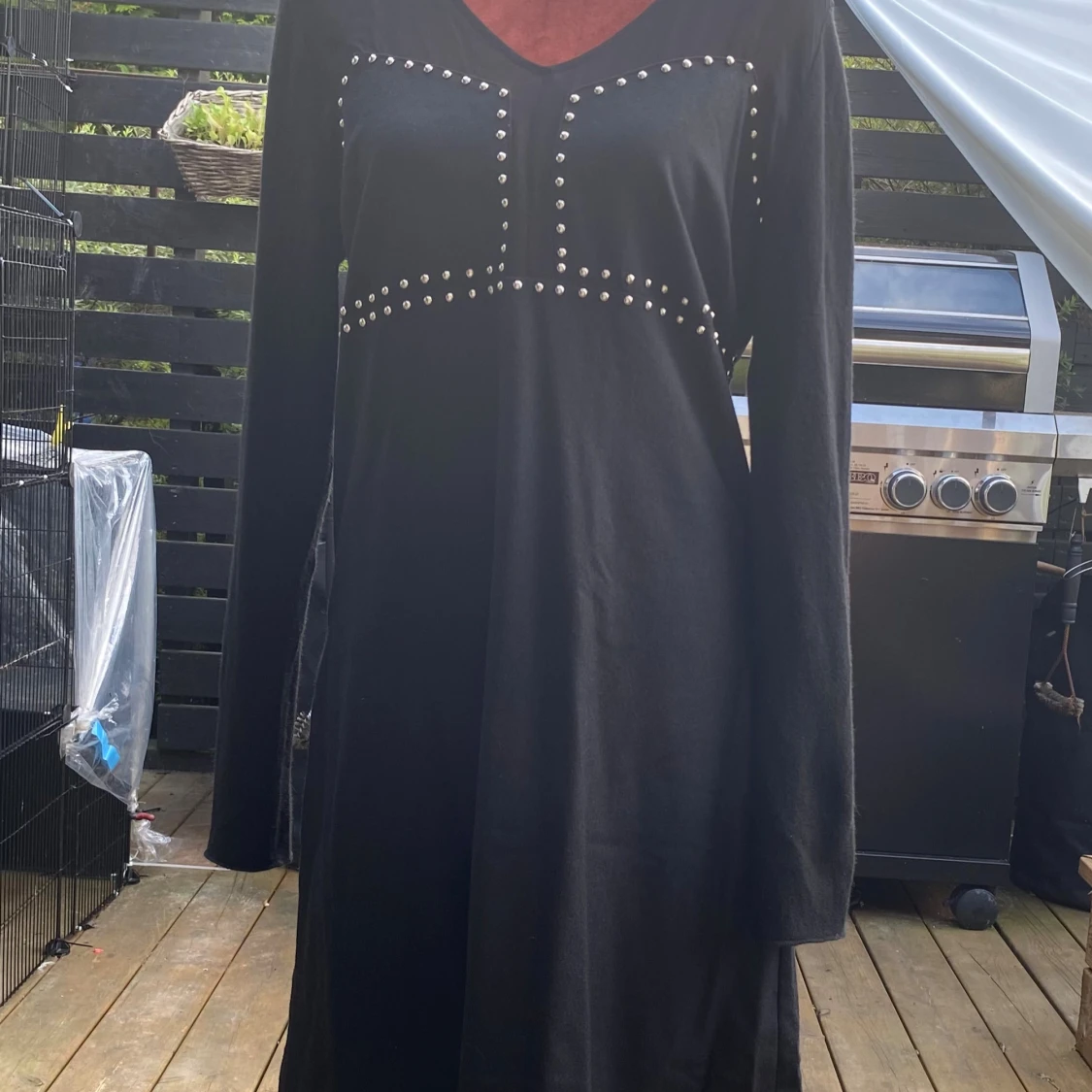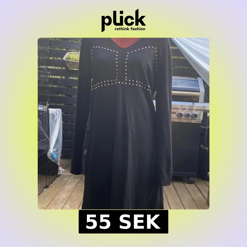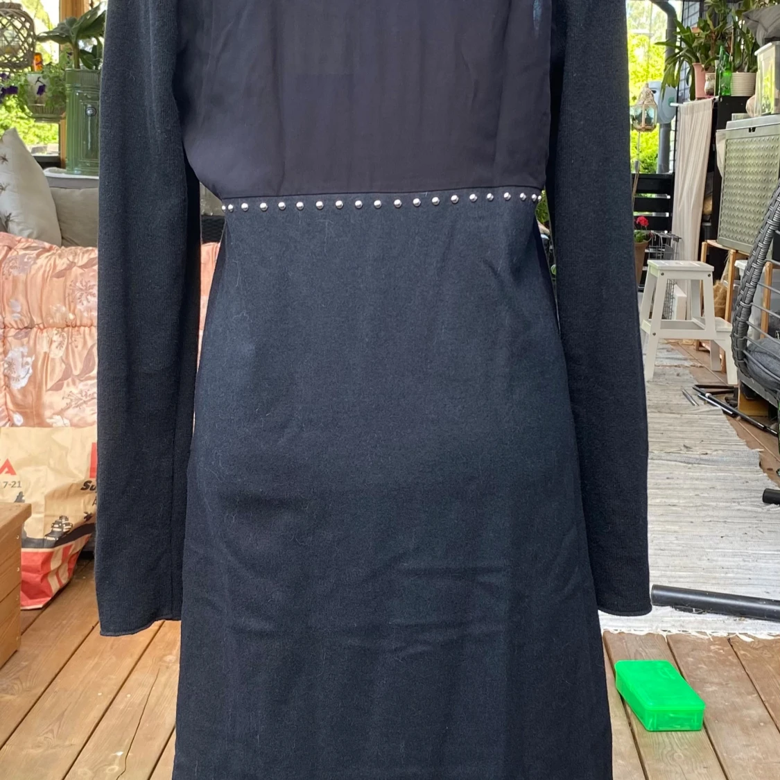 Svart långärmad klänning från Zara med v-ringning och coola silvriga nitar längs byst och midja. Klänningen har dragkedja i sidan och är tillverkad i en mjuk blandning av polyester och viskos. Enkel men edgy look som sticker ut. 2 dolda sidfickor. 72% ull, 27% polyamid, 1% elastan Söm i linning har gått upp, se bild 5! Längd: 99 cm Bystvidd: 50 cm. Inga bilder när den sitter på mig! Katter finns i hemmet! 01,S