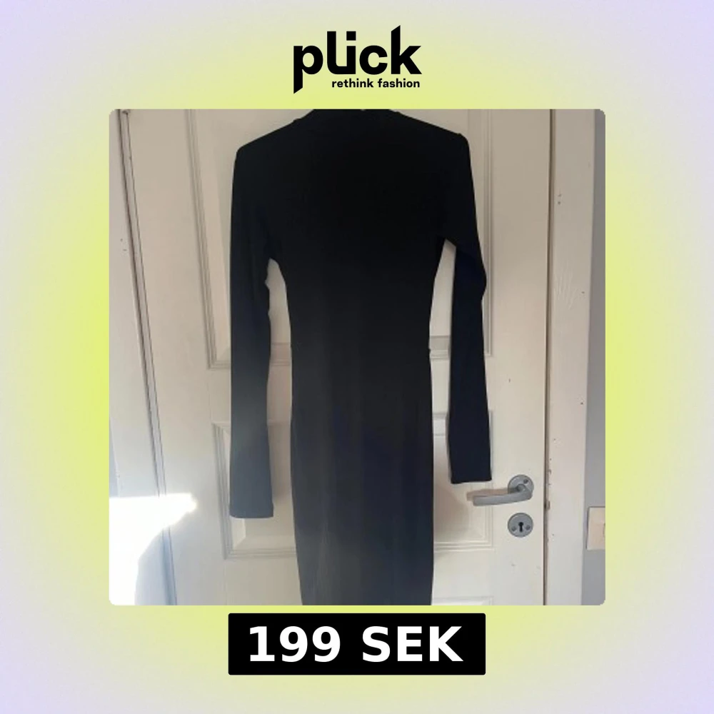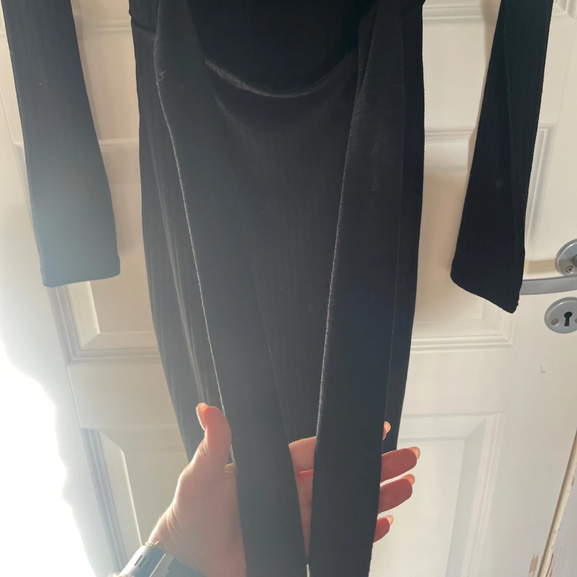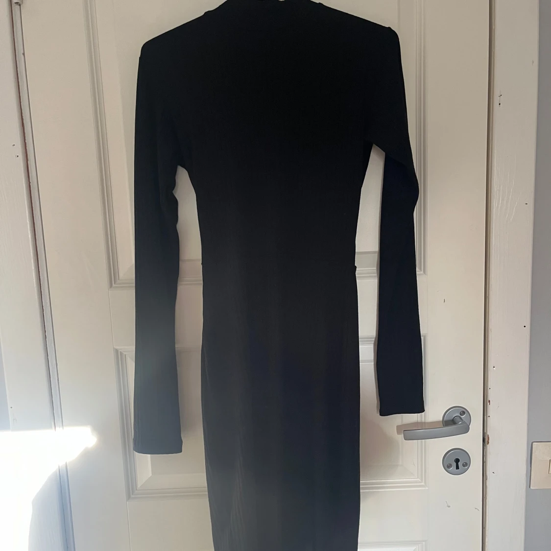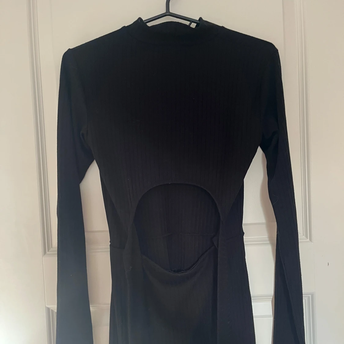 Svart ribbad långärmad klänning med halvpolo och snygg öppen rygg och knytband i ryggen. Klänningen är figurnära och har en längre passform till knäna ungefär. Sparsamt använd, hör av er vid frågor