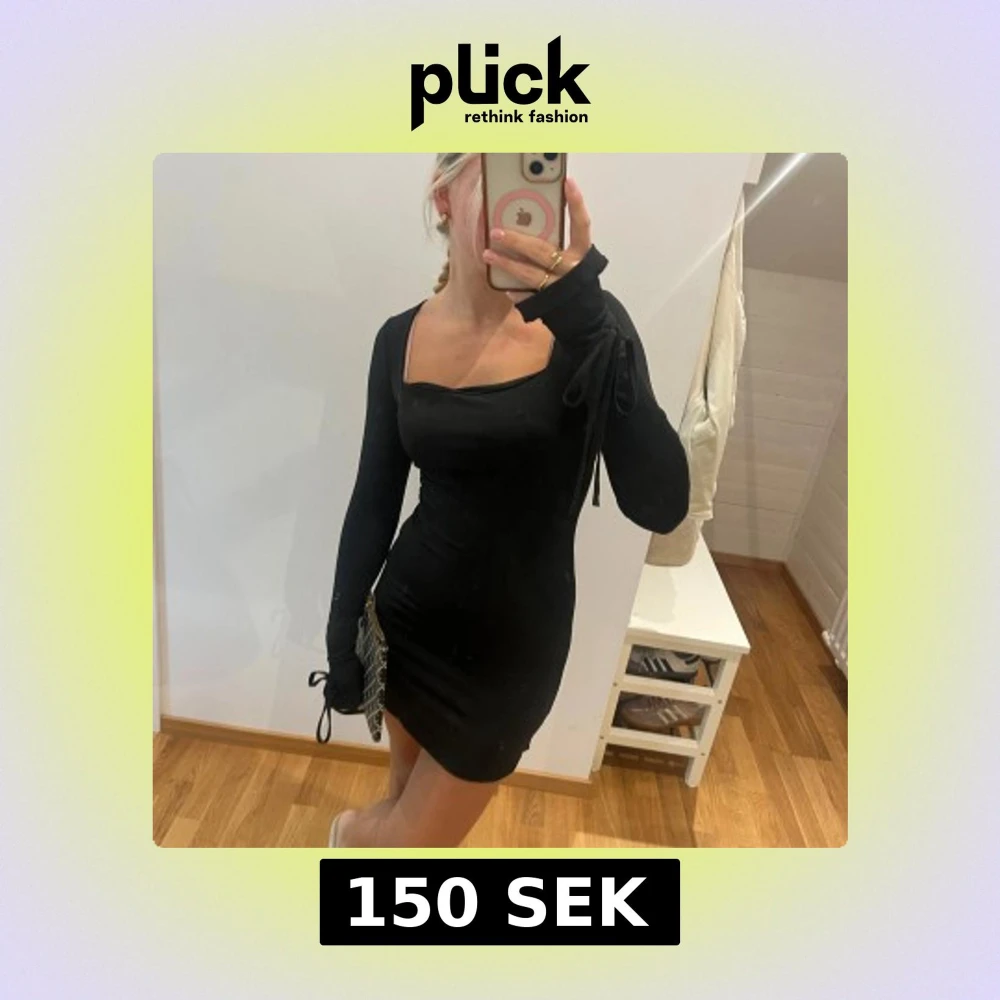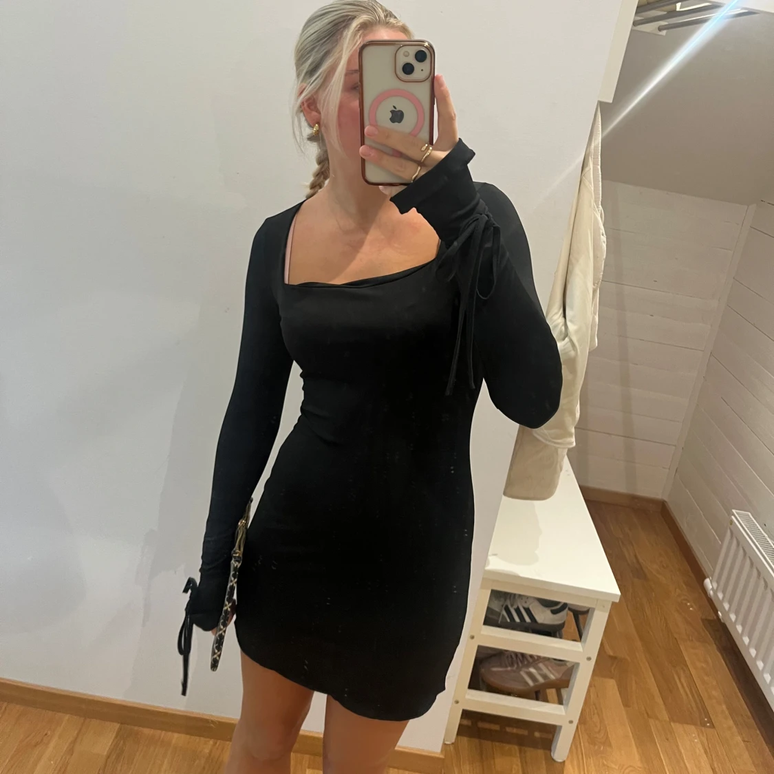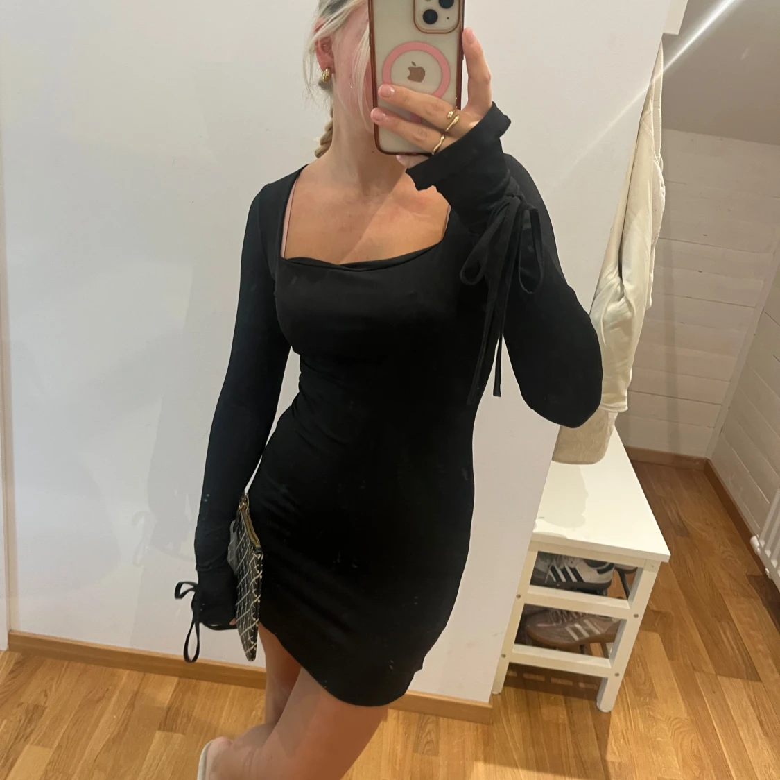 Snygg svart kortklänning med lång ärm och fyrkantig ringning. Klänningen har tight passform och cool snörningsdetalj vid ärmsluten. Perfekt för dig som gillar stilrena och trendiga plagg.