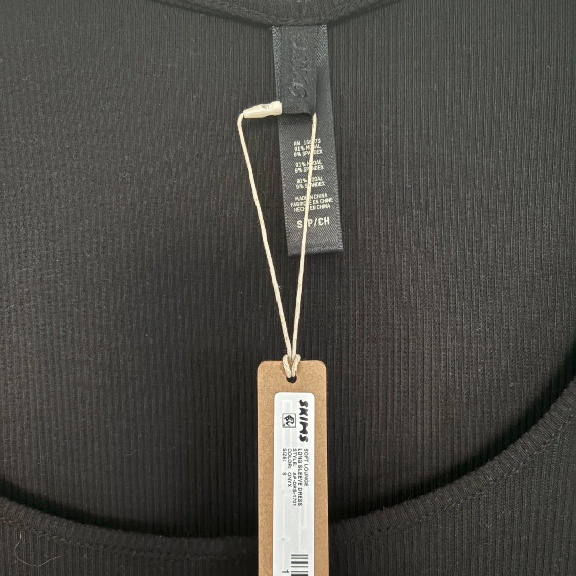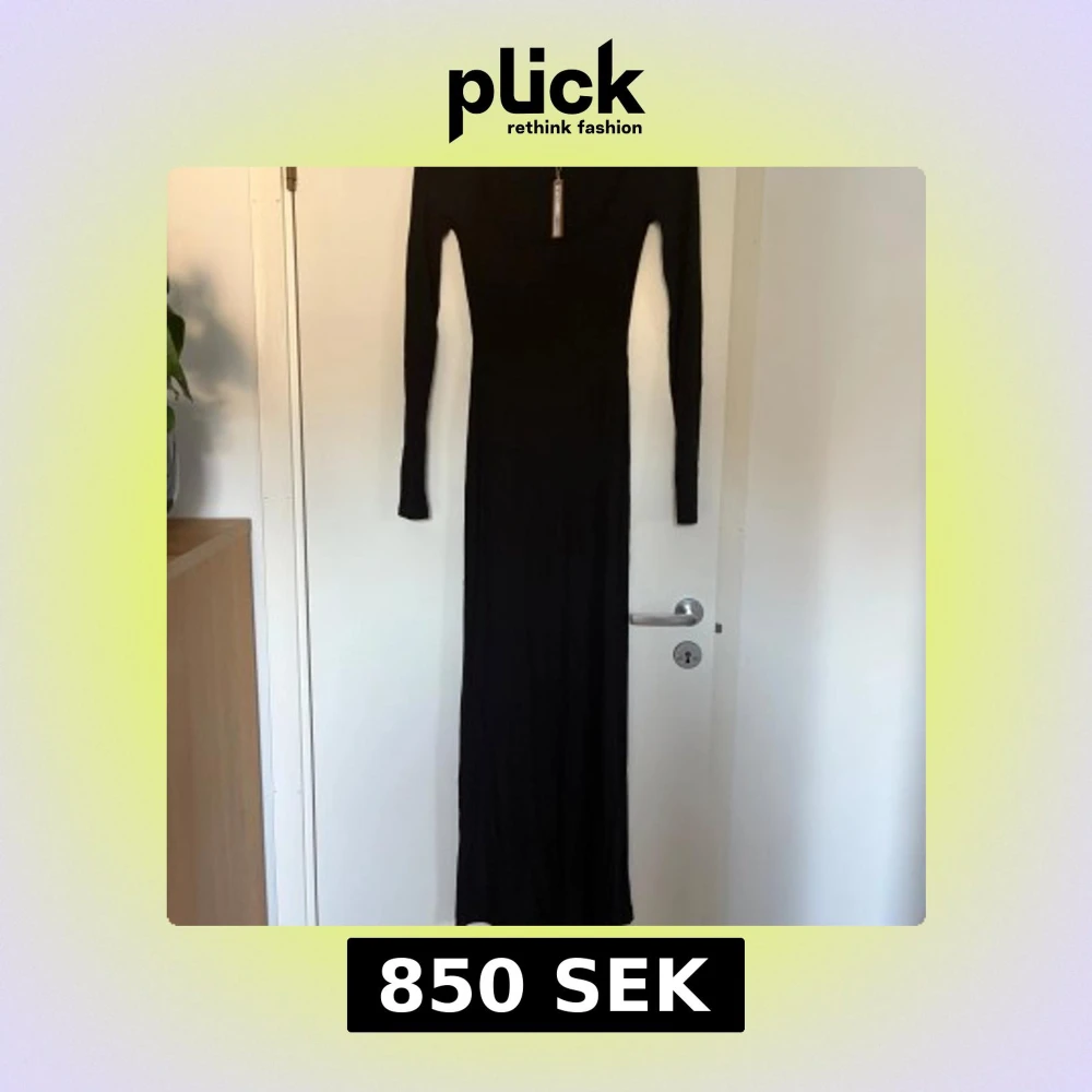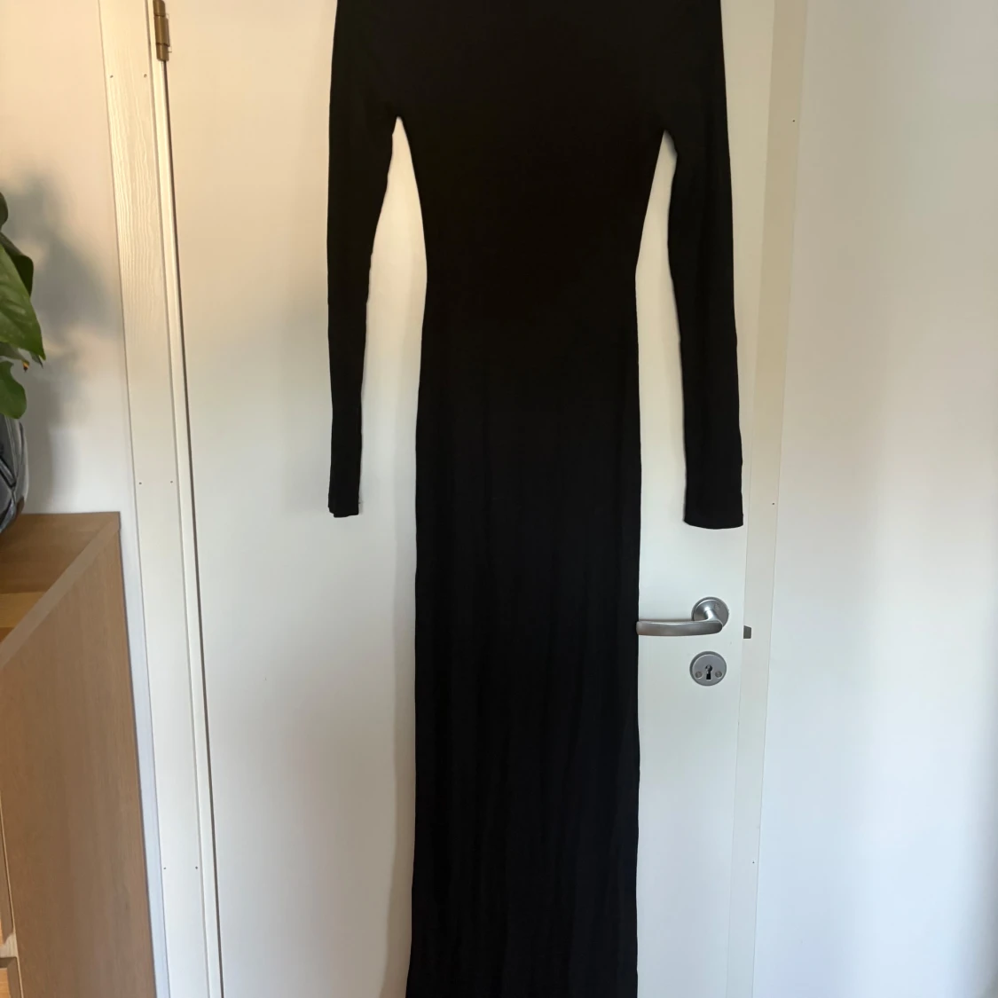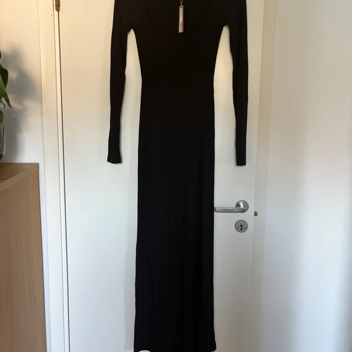 Supersnygg svart långklänning från Skims med lång ärm och rundad urringning. Klänningen är ribbad och har en tight passform. Man får själv stå för frakt.