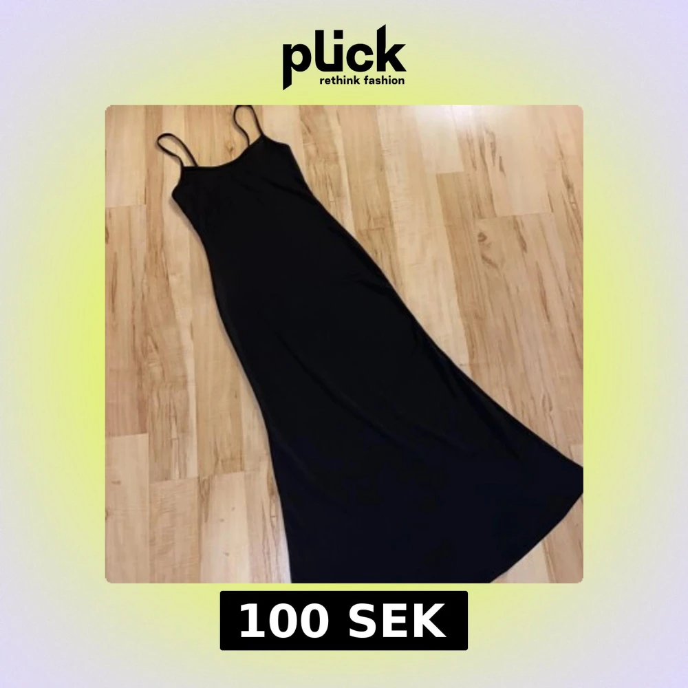 En svart, tajt långklänning som går ända ner till golvet för mig som är 159 😍 den har justerbara axelband. Framhäver figuren supersnyggt och inga defekter 🫶🏻 kan skicka fler bilder