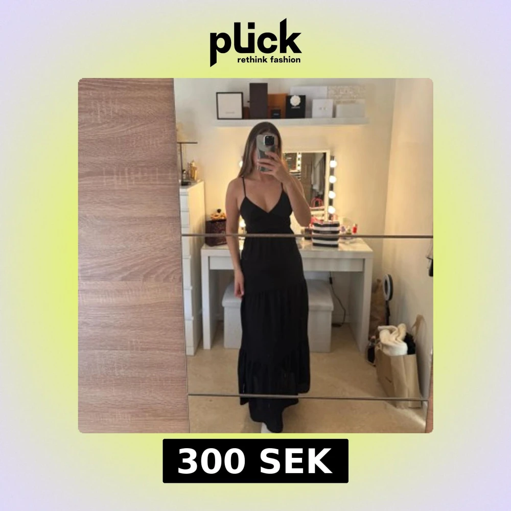 Elegant svart långklänning med smala axelband och v-ringning. Den är i storlek S och köpt från Gina.
