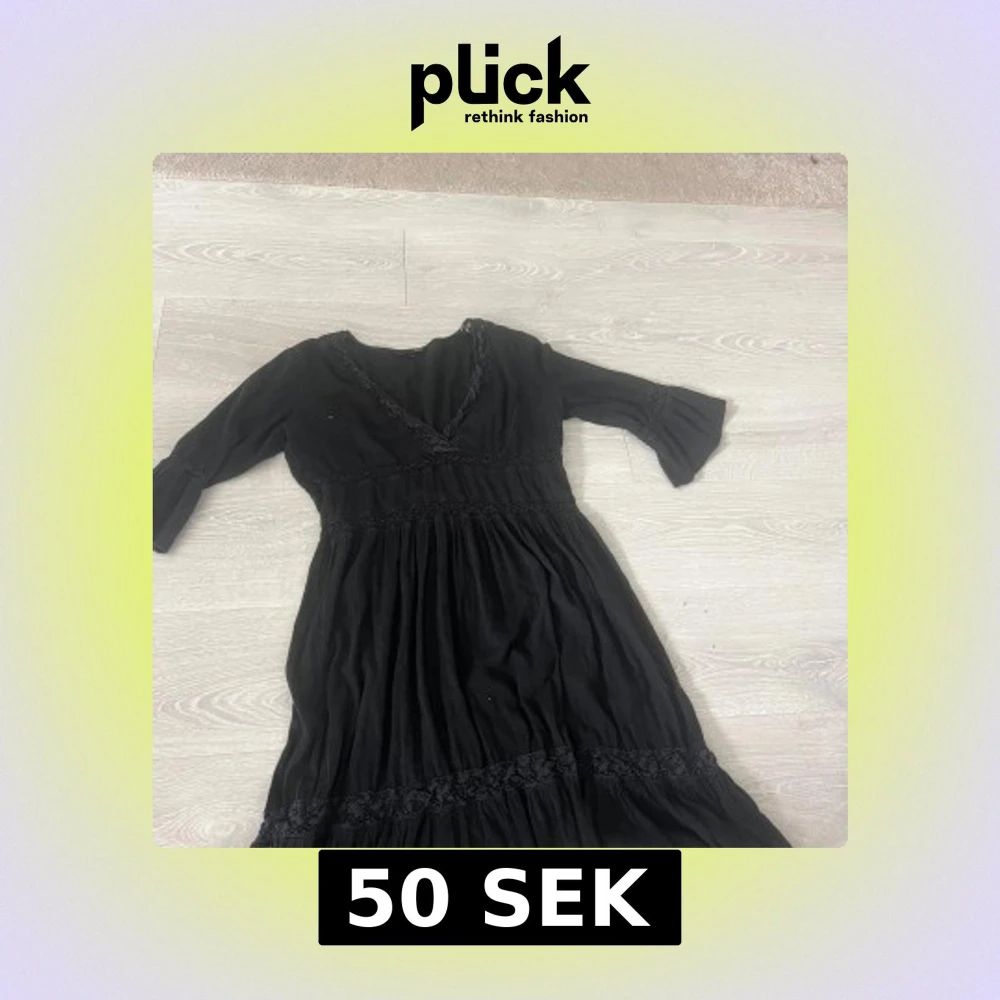 Svart långklänning från H&M med v-ringning och trekvartsärmar. Klänningen har fina spetsdetaljer och ett flowy fall som ger en bohemisk känsla. Perfekt för dig som gillar en avslappnad men ändå stilren look.🌸🌸kontakta via Dm! Kostar endast 50kr