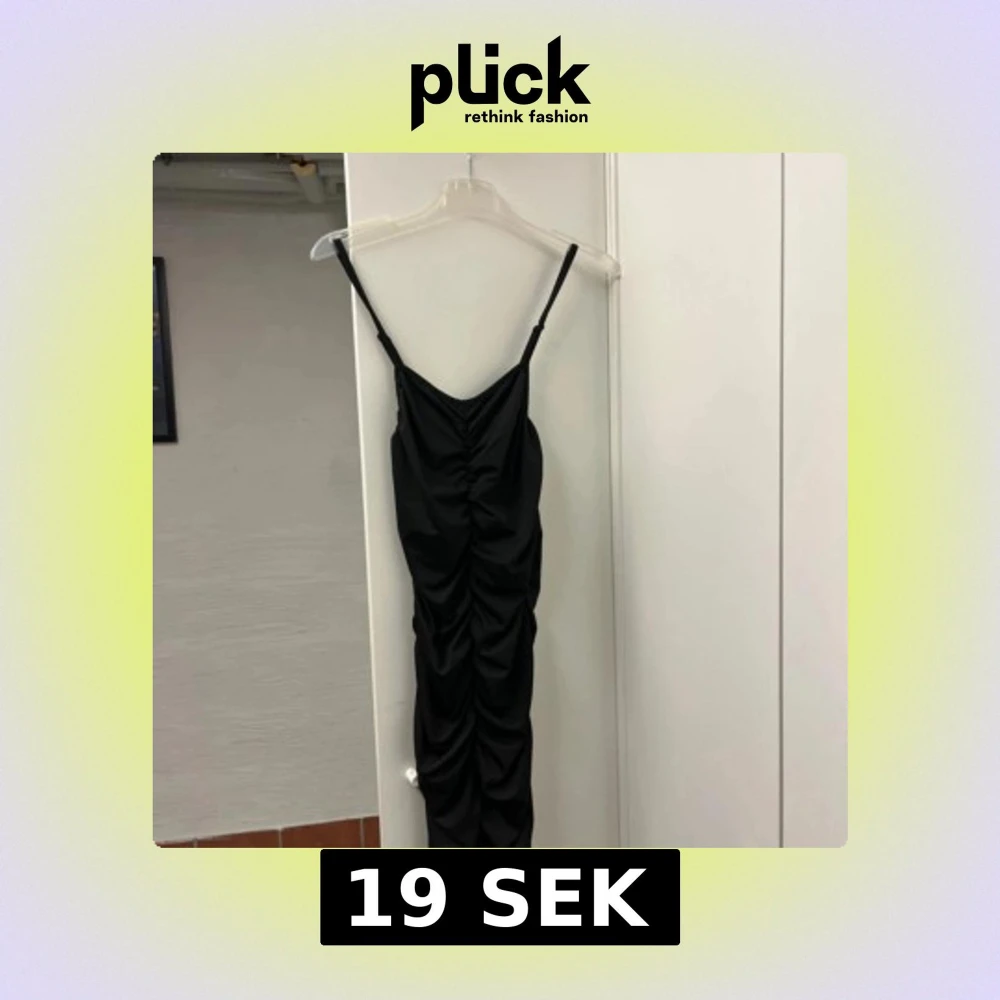 Snygg svart långklänning från SHEIN med smala axelband och rynkade detaljer längs hela klänningen. Modellen är figurnära och har en stilren look som passar perfekt när du vill sticka ut lite extra. Materialet känns mjukt och följsamt mot kroppen.