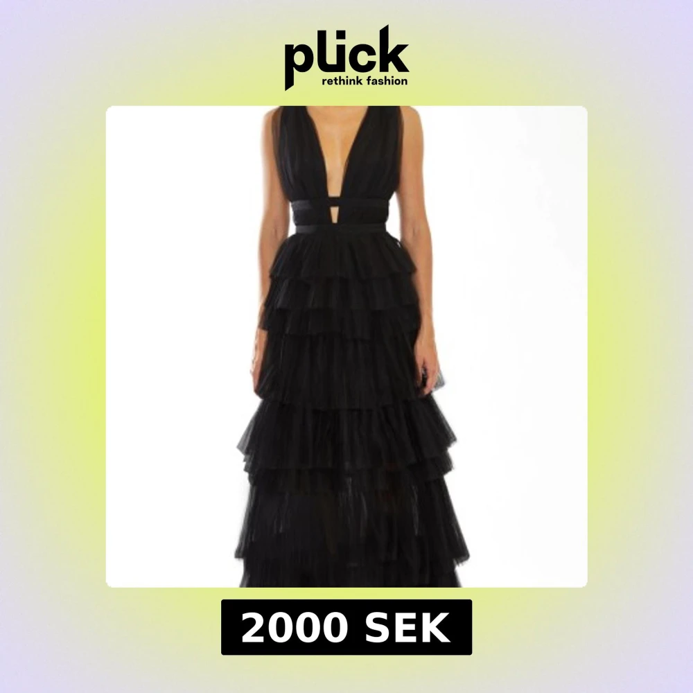 En svart långklänning med volanger och snörning i bak. Använd 1 gång så är i super fint skick. Kostar 2500 ny