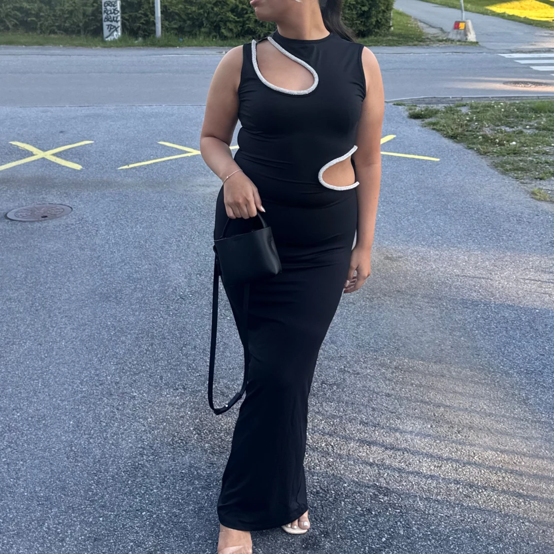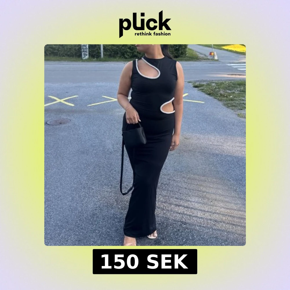 Säljer en svart långklänning med unika cut-outs och glittriga detaljer längs kanterna. Klänningen är ärmlös och har en tight passform som framhäver figuren. Perfekt för dig som vill sticka ut med en modern och edgy look.