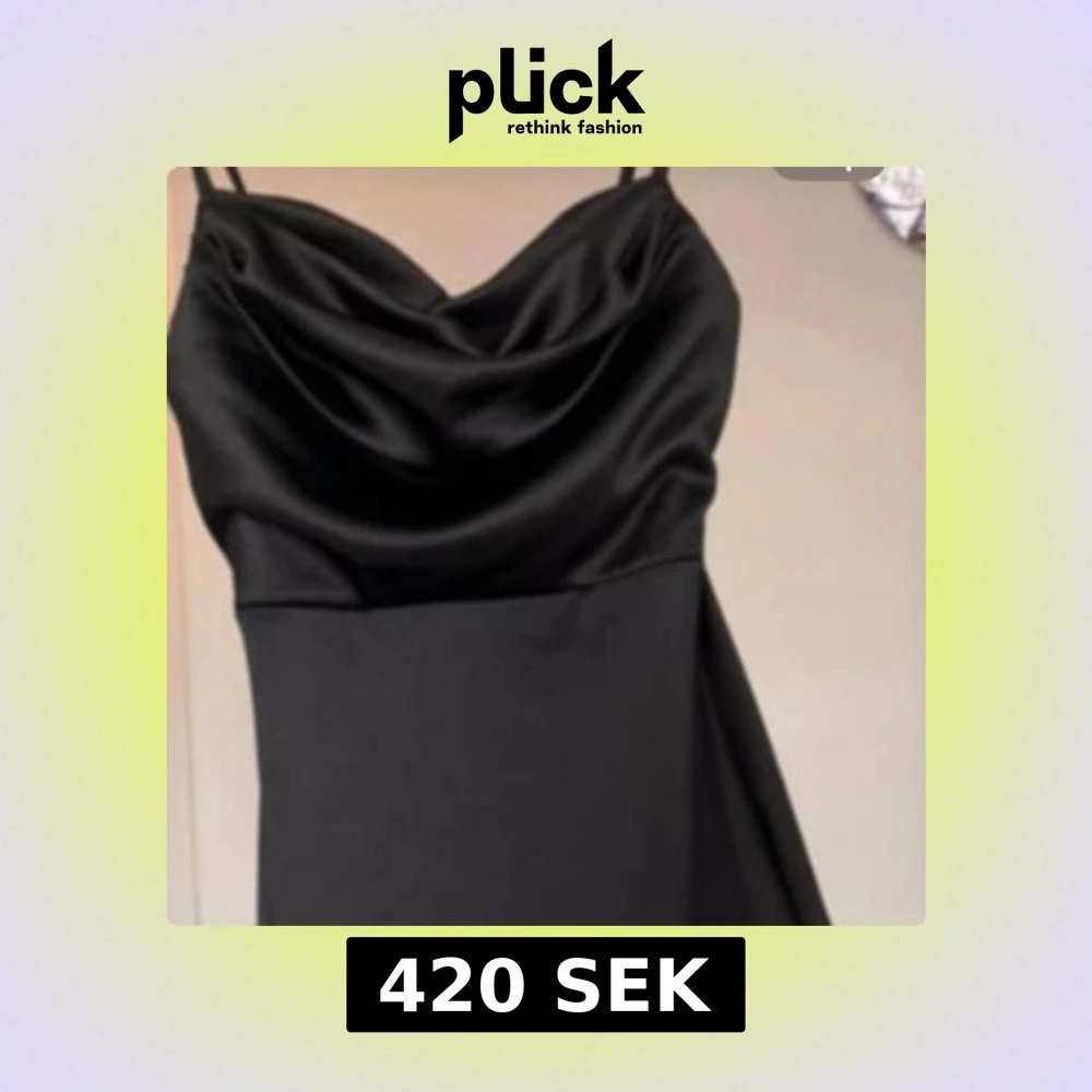 Elegant svart långklänning med tunna axelband lår-hög slits och draperad urringning. Klänningen har en figurnära passform och är tillverkad i ett glansigt, slätt stretchig satin material som ger en lyxig känsla. Nypris:900. Storlek S med material ner till marken passar även till klackar. Klänningen är använd endast en gång