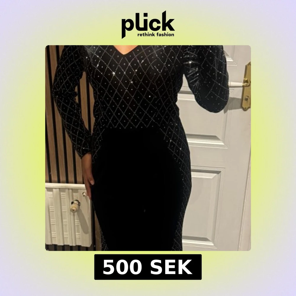 Säljer en svart långklänning med v-ringning och långa ärmar. Klänningen är täckt av ett glittrigt rutmönster med små pärlor som ger en lyxig känsla. Materialet är mjuk sammet som sitter snyggt och har en elegant siluett. Perfekt för dig som vill sticka ut på festen!!! Man får ha i åtanke att jag är kort (160) ) så kolla så att den passar först !