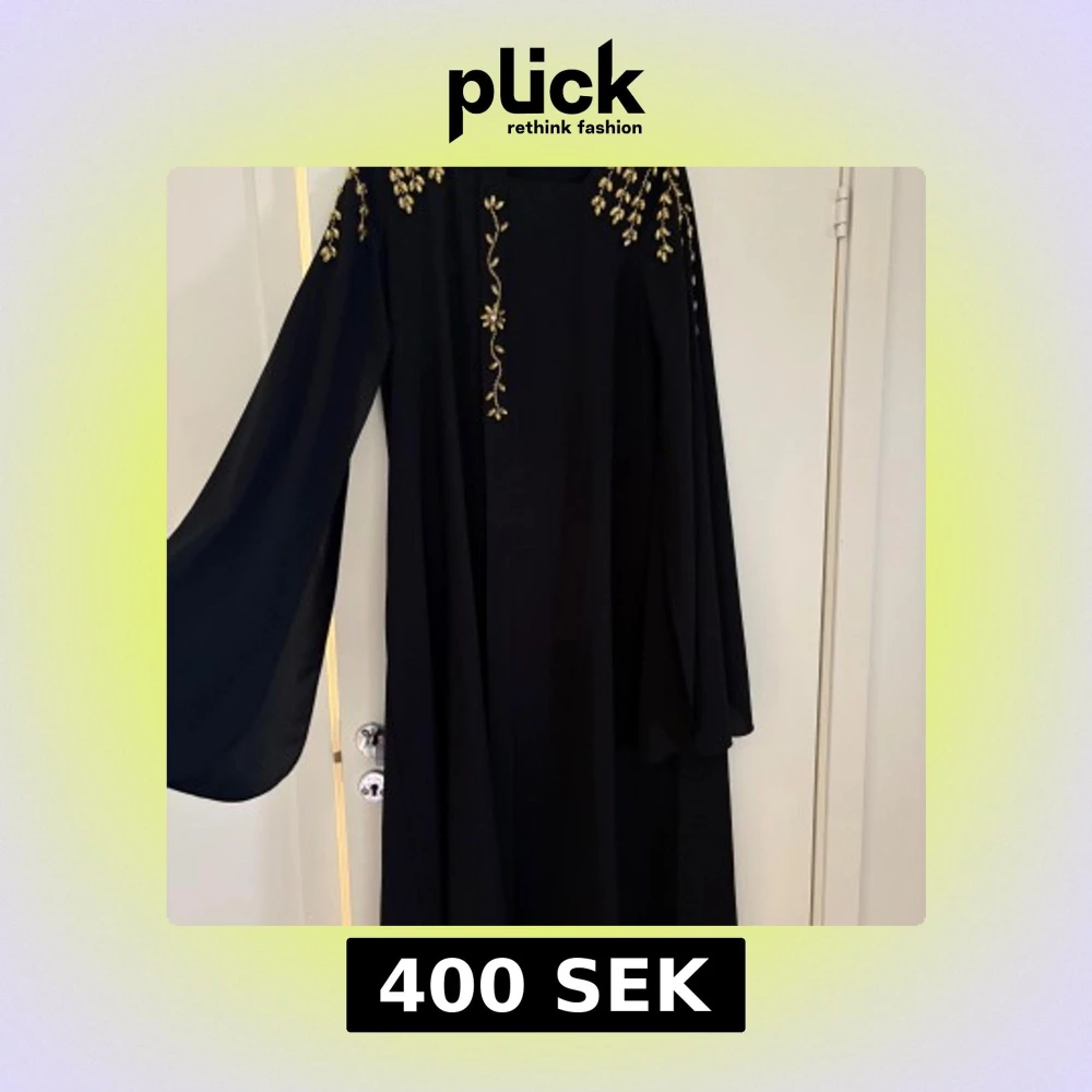 Elegant svart långklänning med vackra guldbroderier på axlarna och längs framsidan. Klänningen har långa ärmar och ett flödande fall som ger en sofistikerad look. Perfekt för speciella tillfällen.
