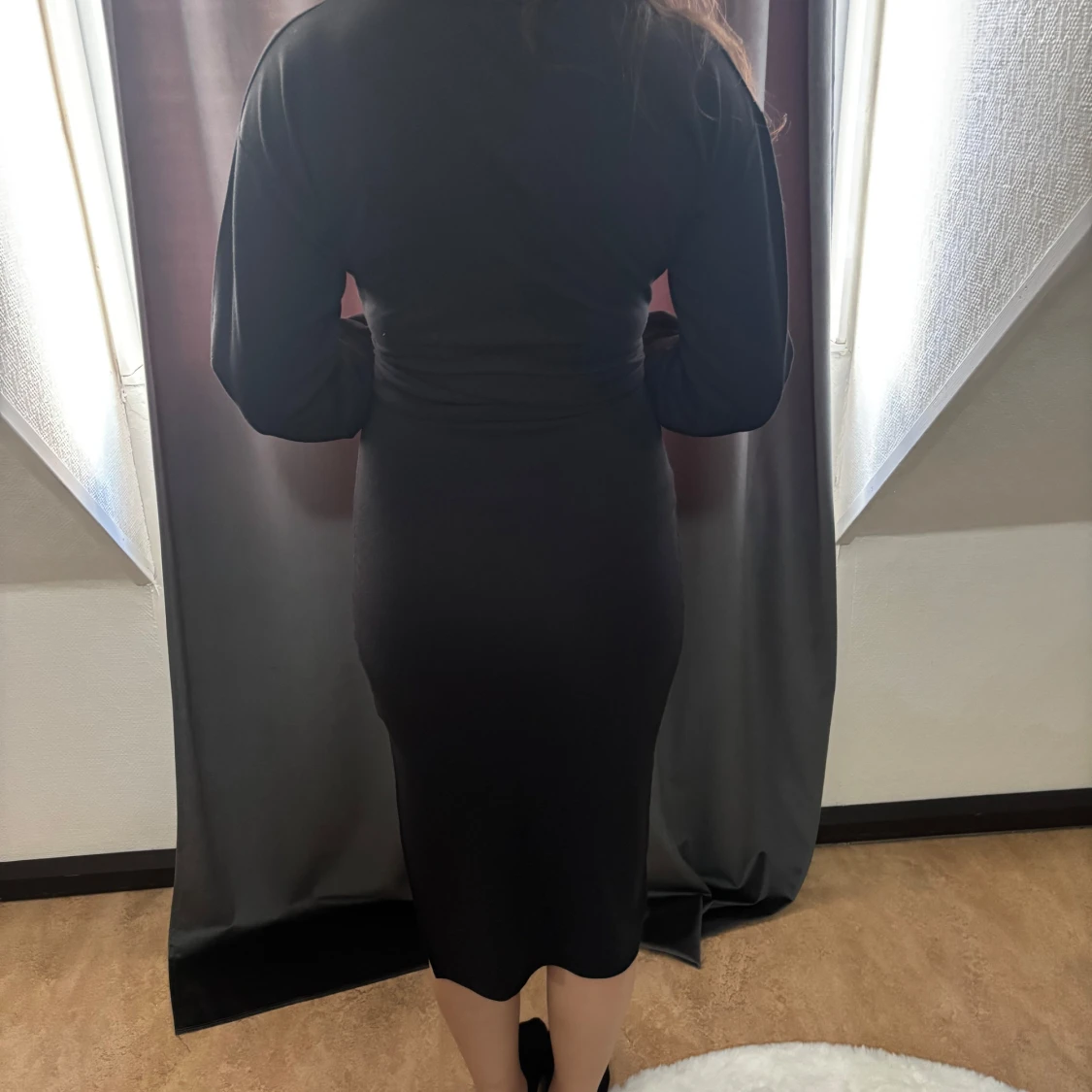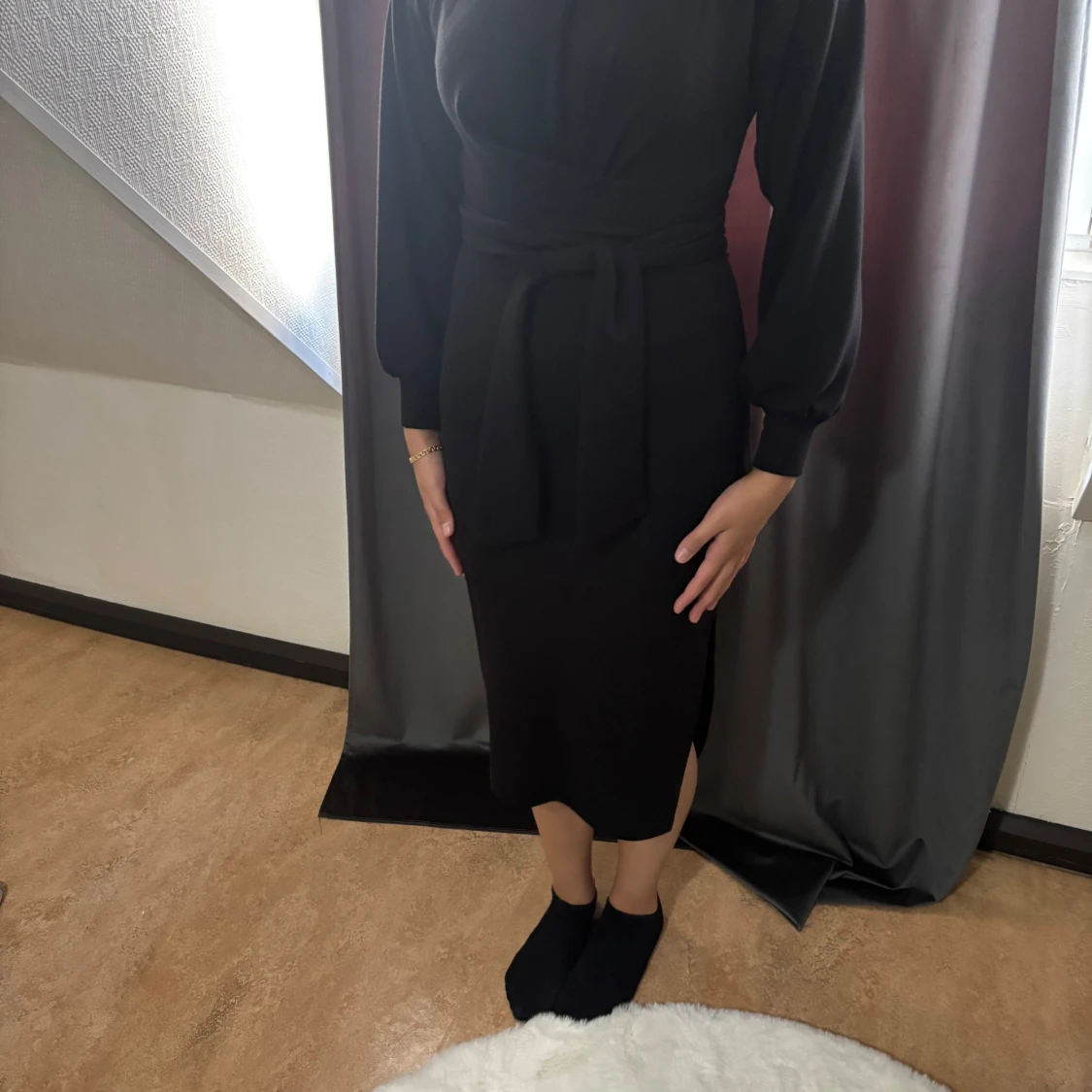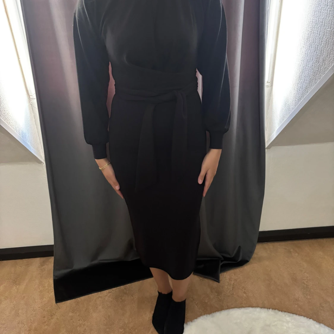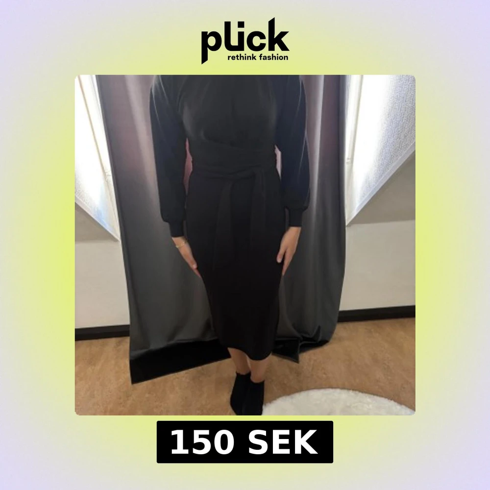 Stilren svart långklänning med långa ärmar och markerad midja tack vare ett brett knytband. Klänningen har en figurnära passform och är tillverkad i ett mjukt, stretchigt material. Perfekt för dig som gillar en klassisk och elegant look.