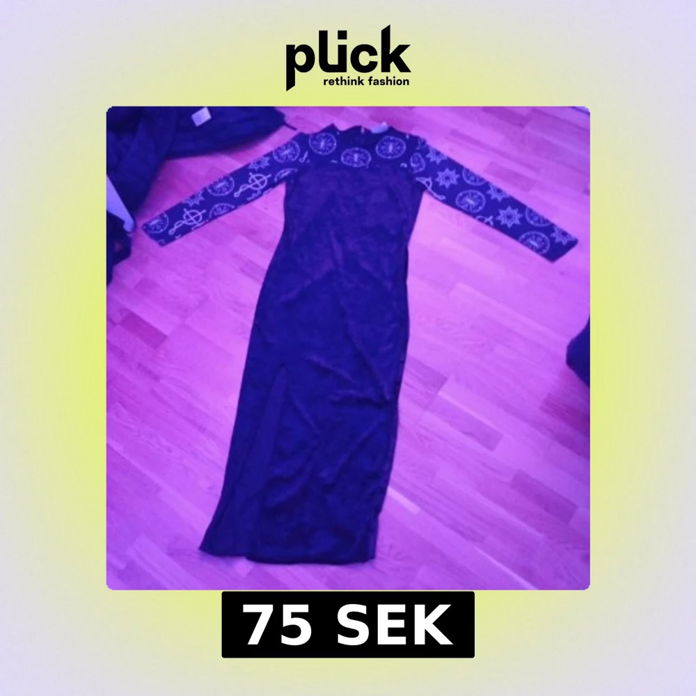 Svart långklänning med sammetsliknande tyg och långa meshärmar med vita mystiska symboler. Klänningen har en slits framtill och figurnära passform. Ärmarna är transparenta och dekorerade med stjärnor och cirklar för en edgy look.