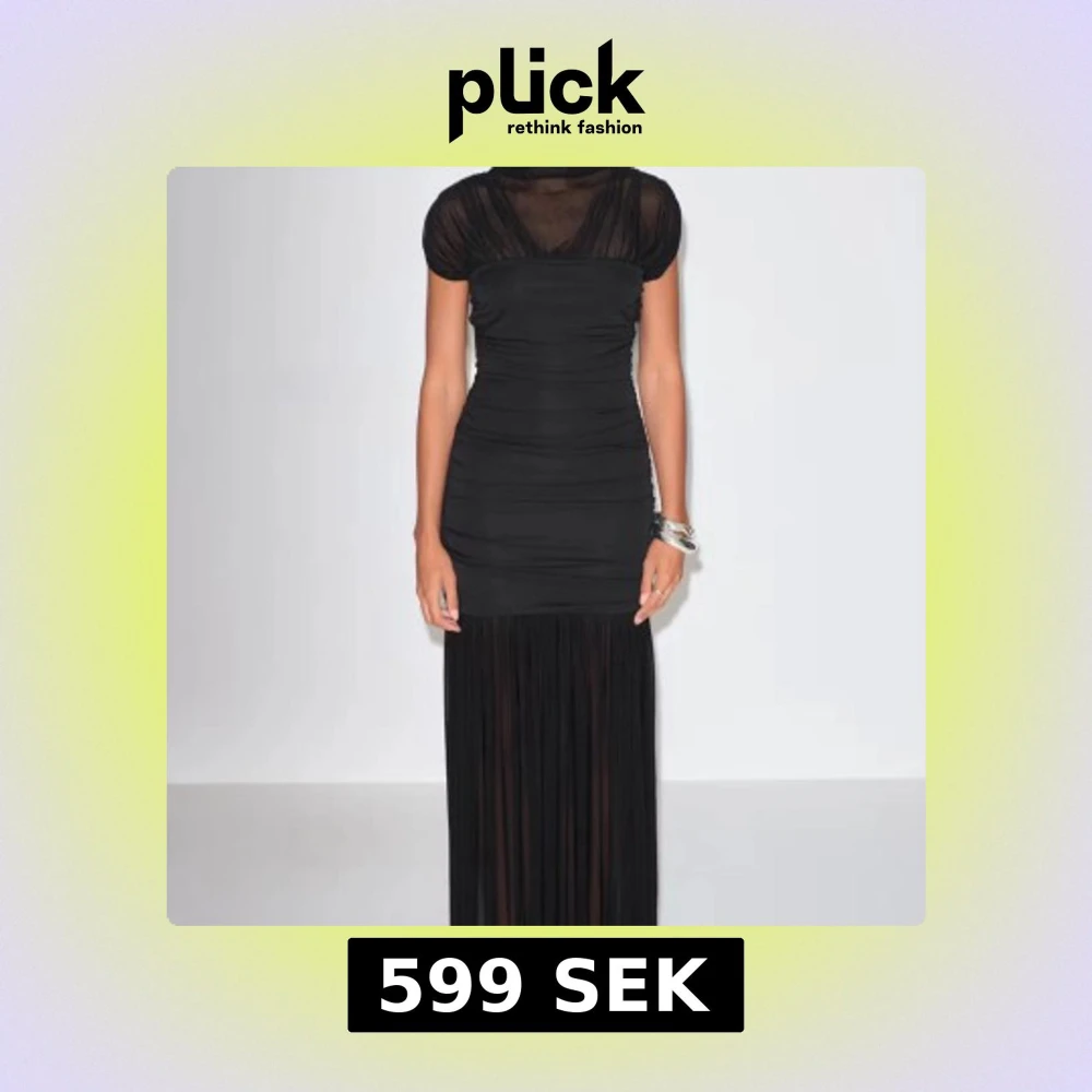 Svart långklänning med transparent mesh upptill och över axlarna samt plisserad, genomskinlig nederdel. Klänningen har korta ärmar och figurnära passform upptill, vilket ger en snygg och modern siluett.