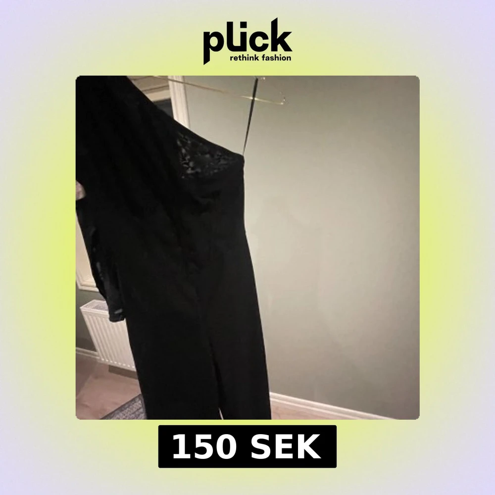 Säljer en svart byxdress med oneshoulder-design och lång ärm. Klänningen har en stilren look med lätt transparent tyg på axeln och en figurnära passform. Perfekt för dig som vill sticka ut med en elegant och modern stil.
