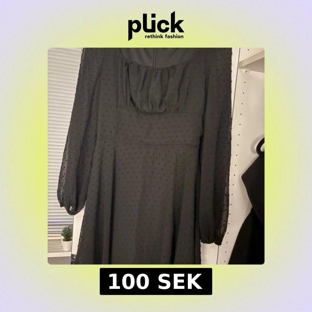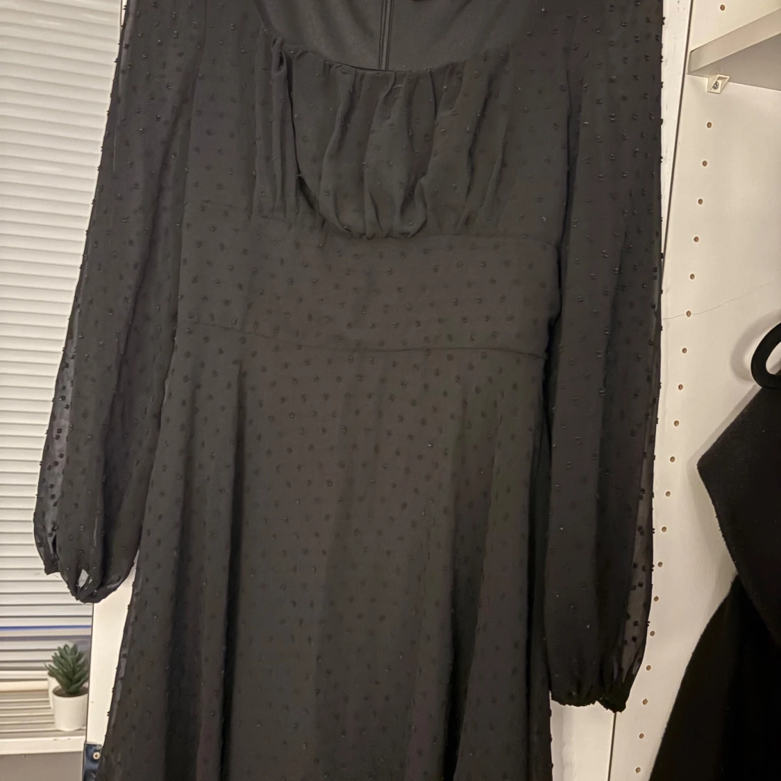 Säljer en svart långklänning med diskret prickigt mönster. Klänningen har transparenta långärmar med resår vid ärmslut och en lätt rynkad detalj vid halsen. Tyget är tunt och ger en luftig känsla, perfekt för dig som gillar stilrena och klassiska looks.
