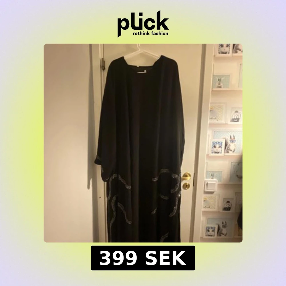 En svart långklänning med vida ärmar och rund halsringning. Klänningen har snygga silverfärgade broderade detaljer längs nederdelen och ärmarna som ger en cool touch. Passformen är loose och tyget faller mjukt. Perfekt för dig som gillar en stilren och bekväm look.