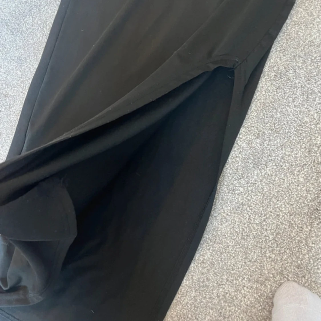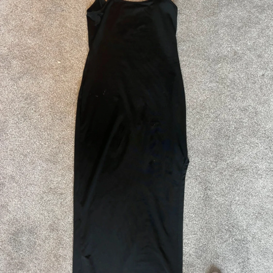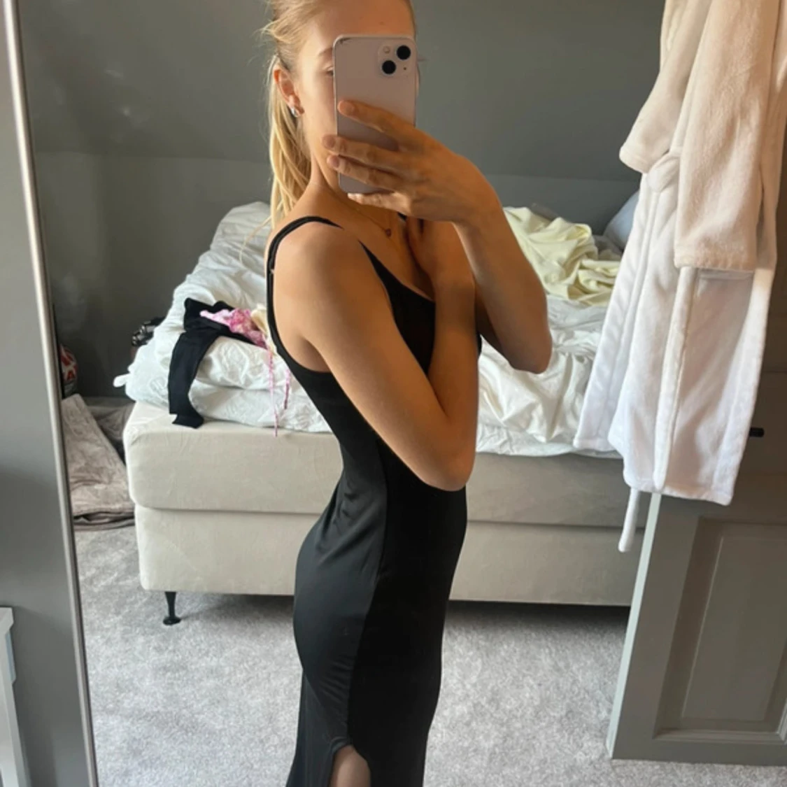Säljer en svart långklänning med smala axelband och tight passform. Klänningen har en snygg slits på sidan. Perfekt för dig som gillar stilrena och enkla plagg. Materialet känns mjukt och stretchigt.