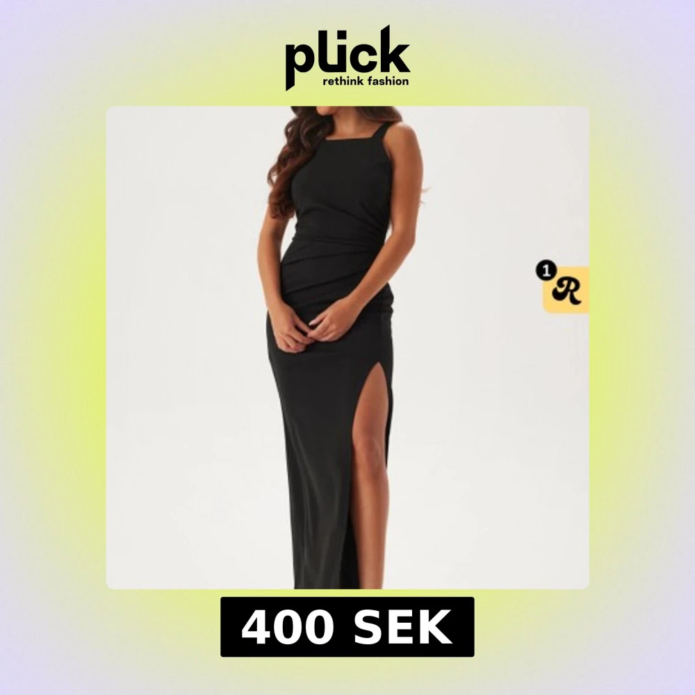 Supersnygg svart långklänning med breda axelband, figurnära passform och hög slits på ena sidan. Klänningen har draperade detaljer i midjan och en öppen rygg med dragkedja. Perfekt för dig som vill sticka ut med en elegant och stilren look. Endast använd 2 gånger