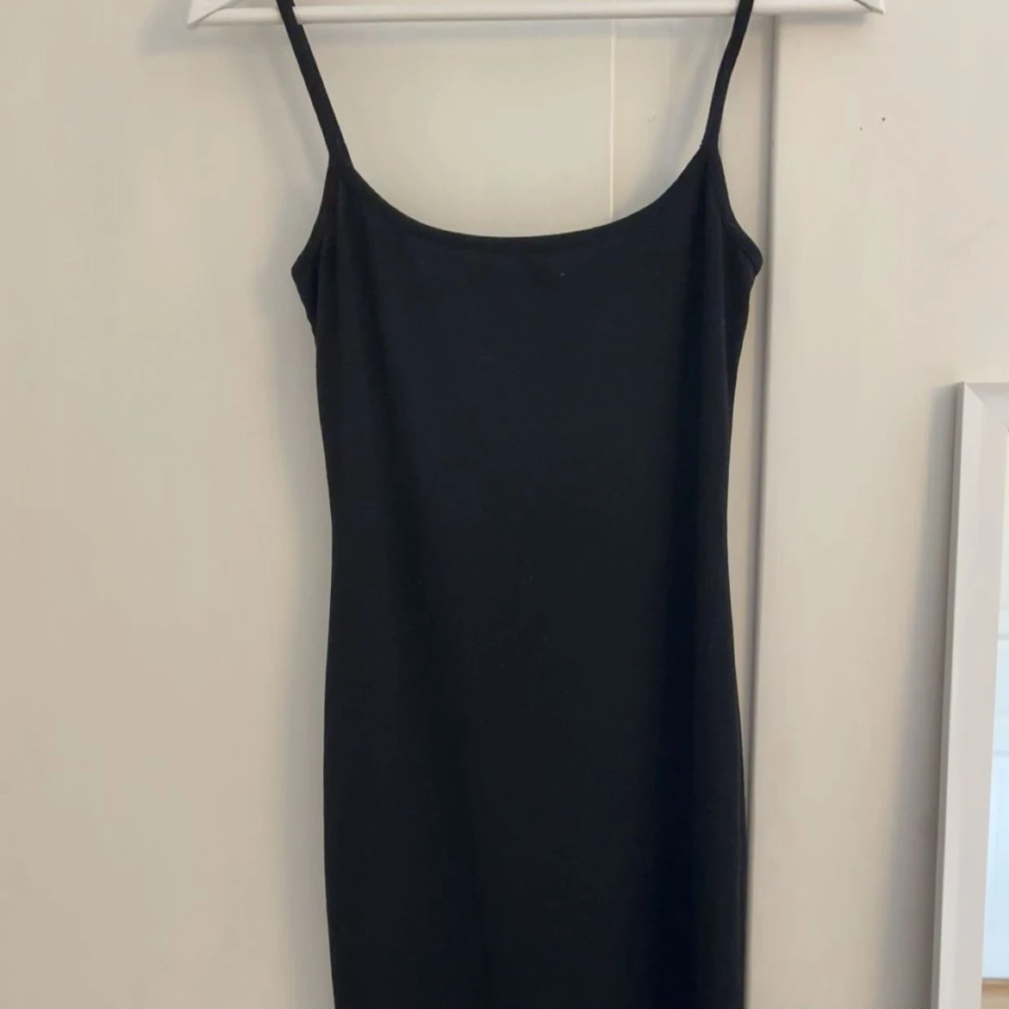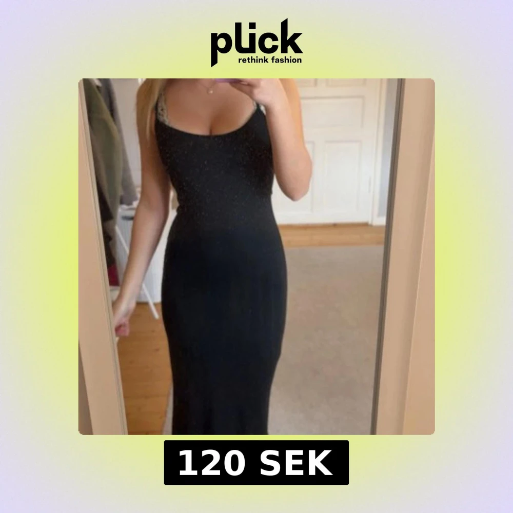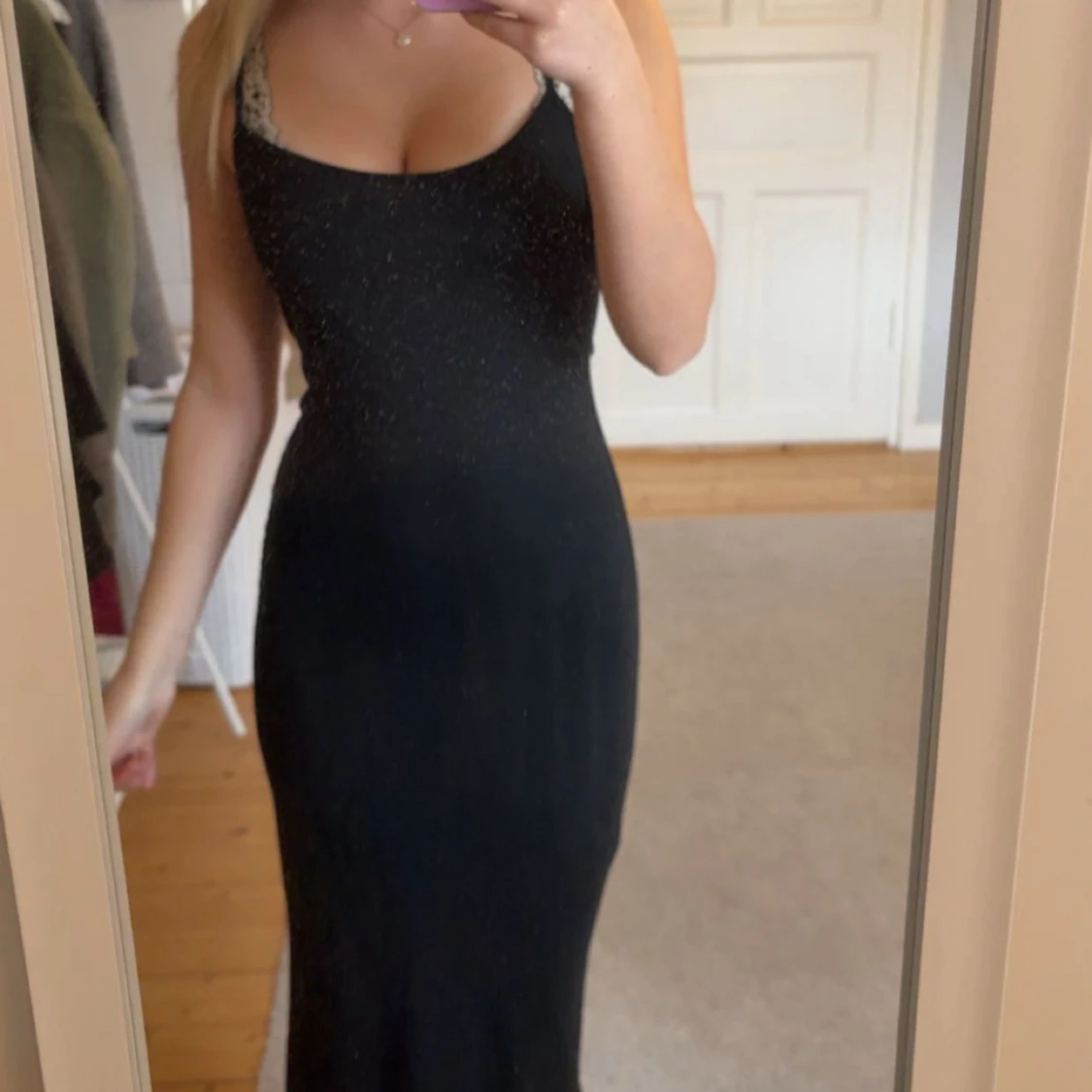 Säljer en svart långklänning med smala axelband och figurnära passform. Klänningen har en enkel och stilren design med lätt glittrig yta som ger en snygg touch. Perfekt för dig som gillar minimalistisk stil och vill ha något som sticker ut lite extra. Räcker ner till fötterna på mig som är 166