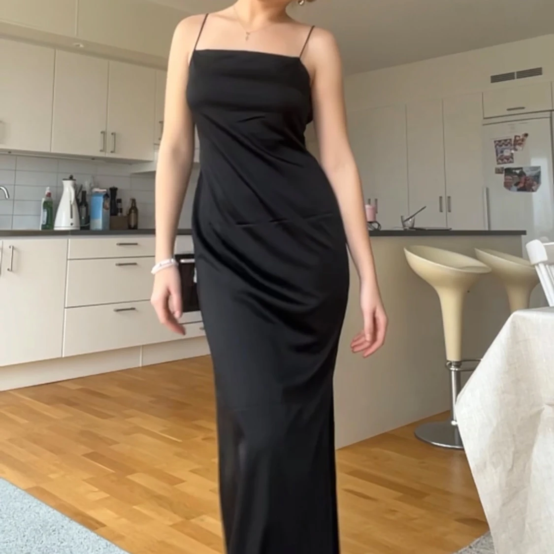 Elegant svart långklänning med smala axelband och öppen rygg. Passar utmärkt till studentbal. Aldrig använd, bara testad, prislapp kvar