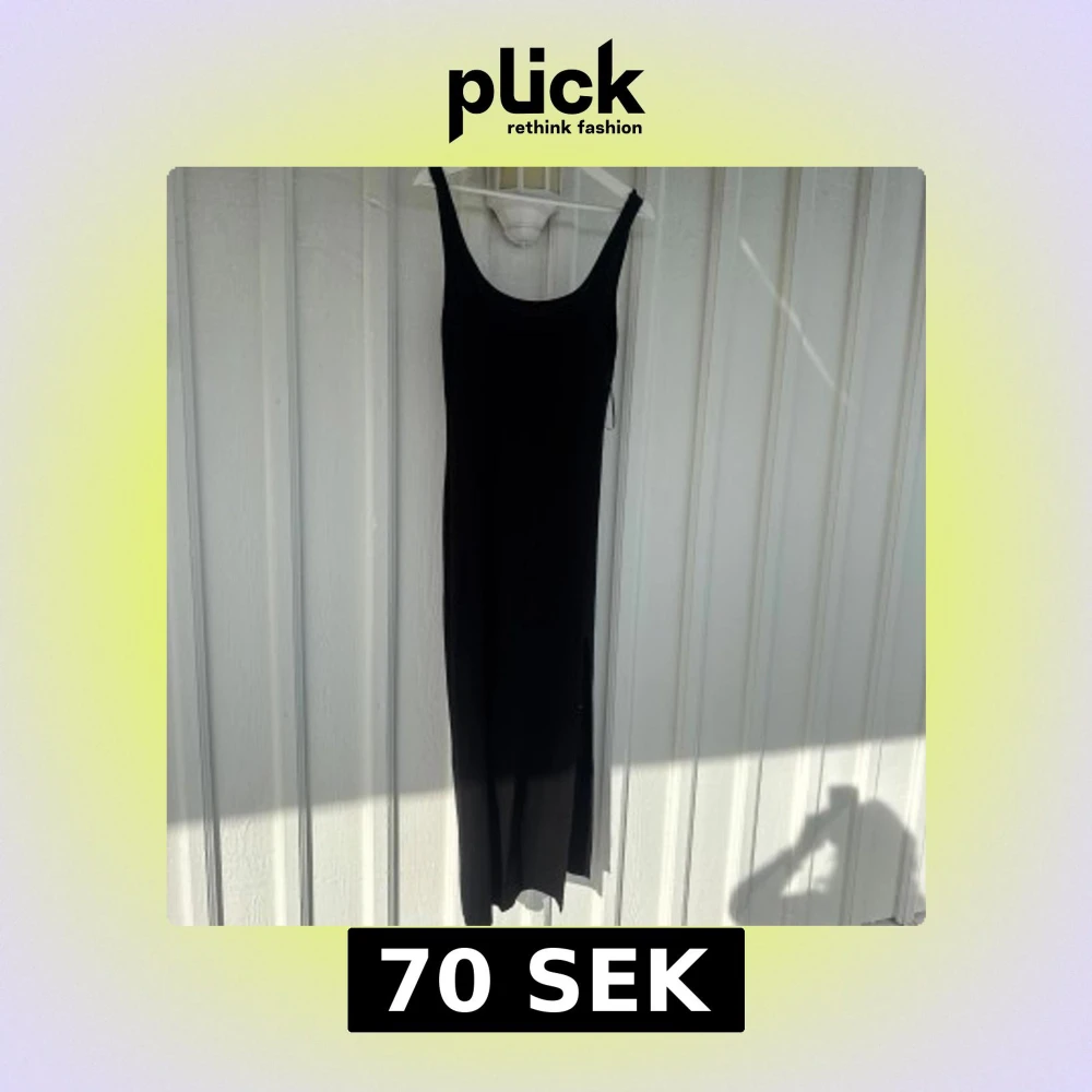 En stilren svart långklänning med smala axelband och rundad urringning. Klänningen har en rak passform och är ärmlös, perfekt för en enkel och elegant look.