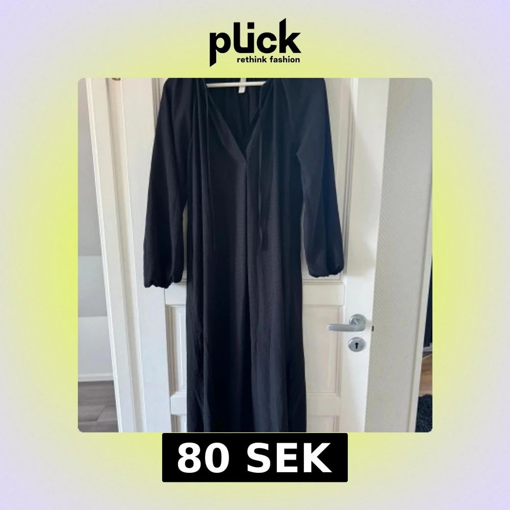 Snygg svart långklänning i storlek XS med v-ringad hals och långa ärmar. Klänningen har ett diskret strukturmönster i tyget och knytband vid halsen. Perfekt för dig som gillar enkel och stilren design med lite extra detaljer.