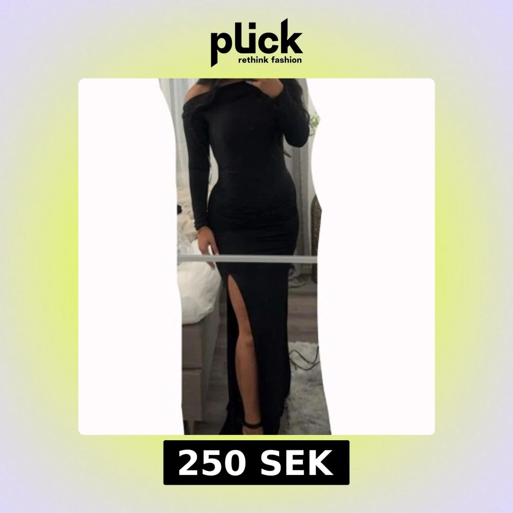 Supersnygg svart långklänning med offshoulder och lång ärm. Klänningen har en tight passform och en hög slits framtill. Köpt från Bubbleroom för 799kr endast använt 1 gång
