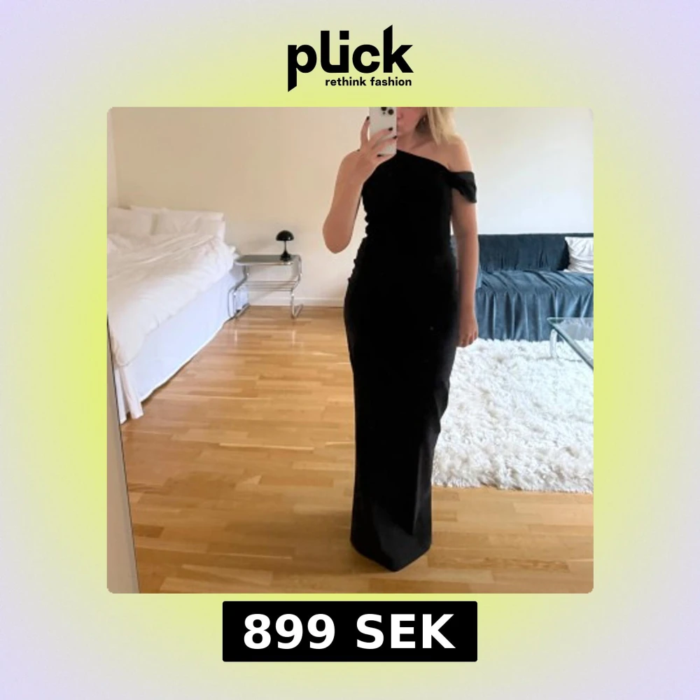 Säljer en elegant svart långklänning med oneshoulder-design. Klänningen har en figurnära passform och är axelbandslös på ena sidan, vilket ger en stilren och modern look. Perfekt för dig som vill sticka ut med en klassisk och tidlös stil.