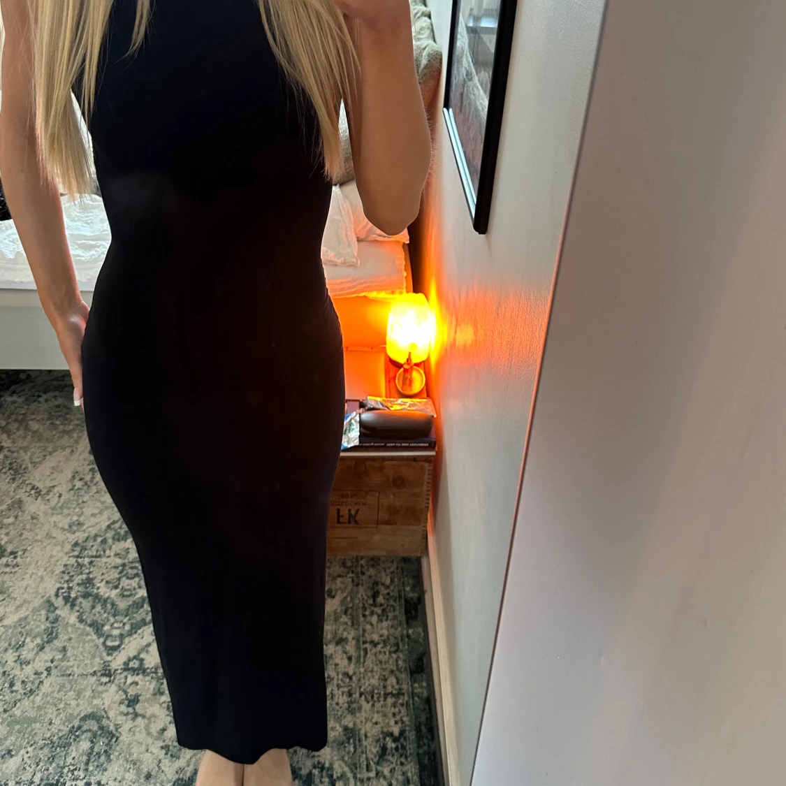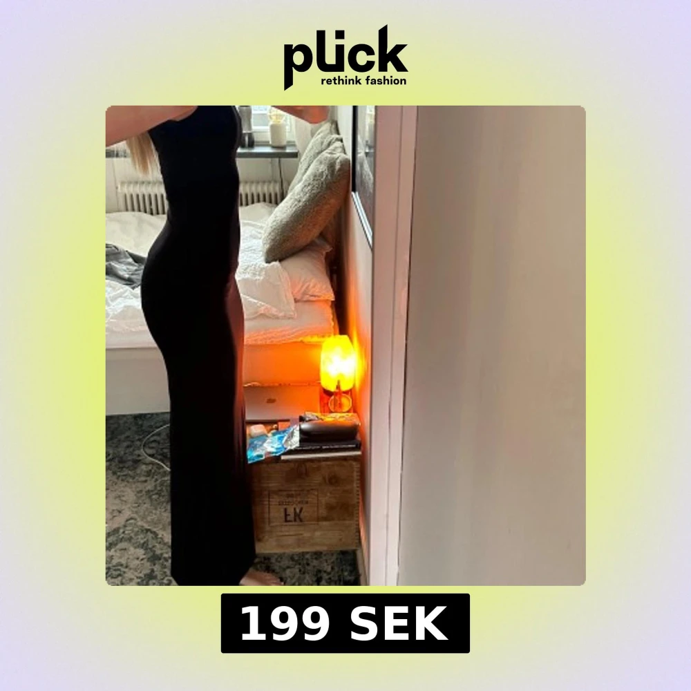 Snygg svart långklänning med tight passform. Skönt material (lite ”glansigt” material typ) Jag e en xs/s💕