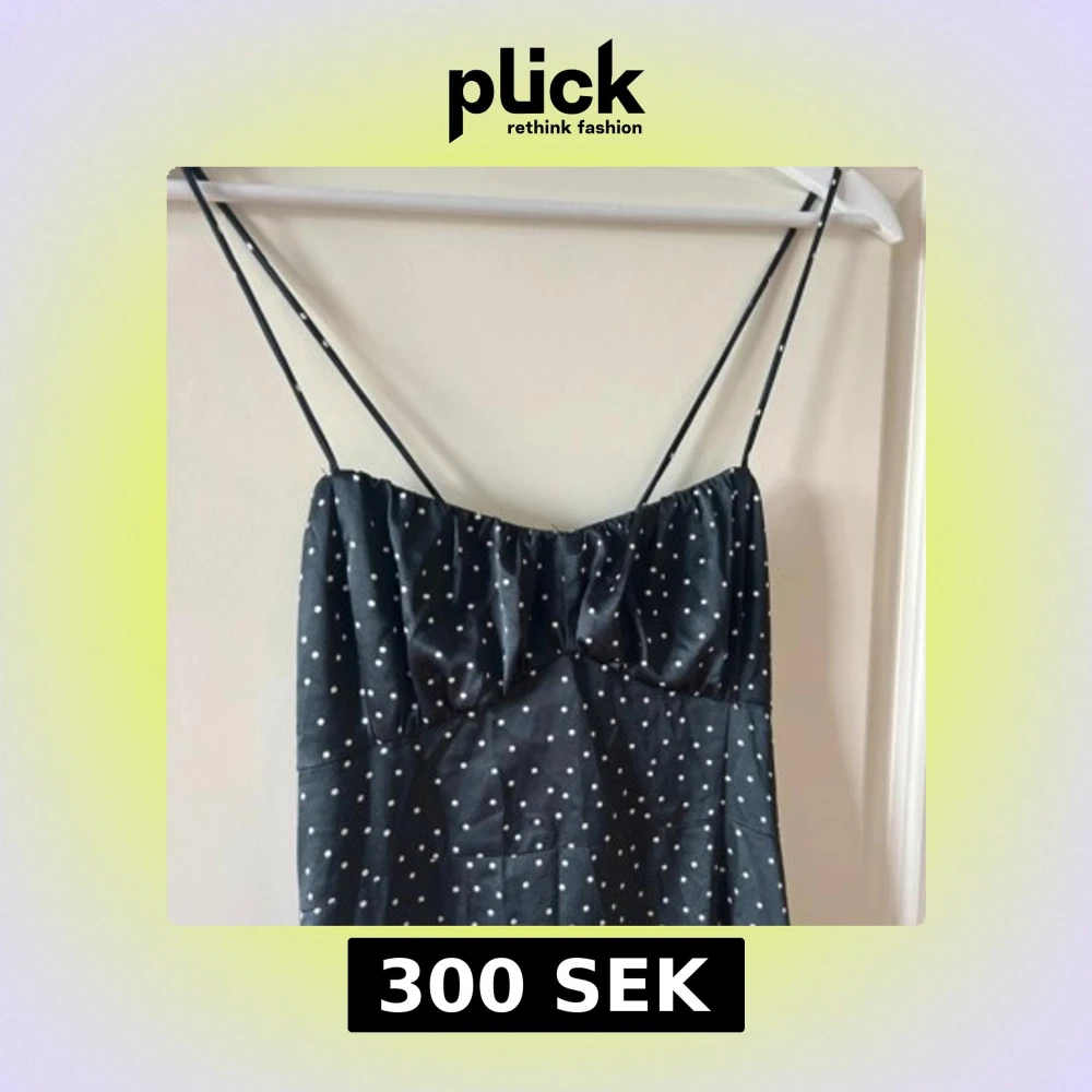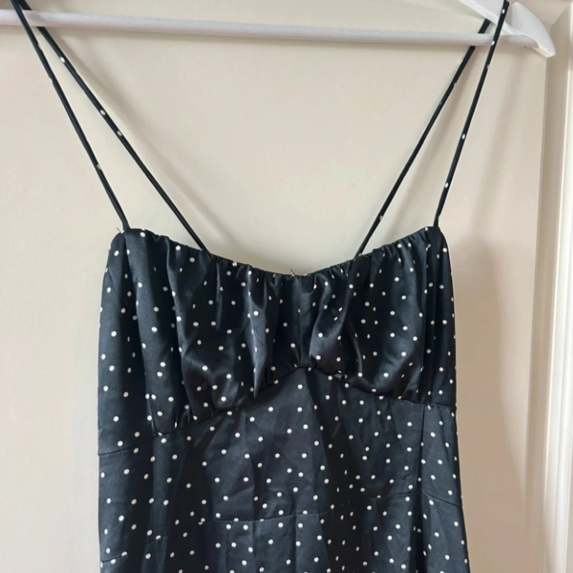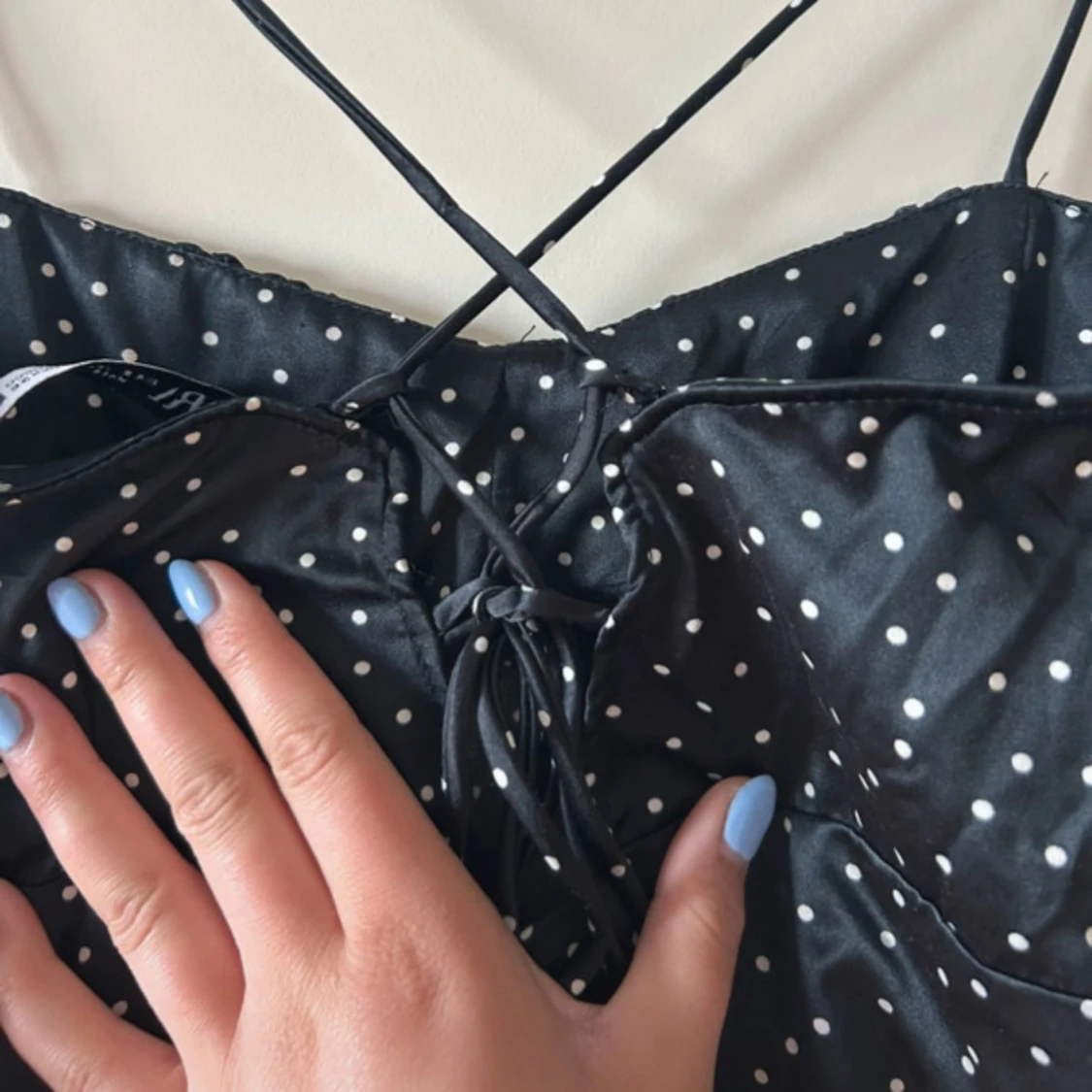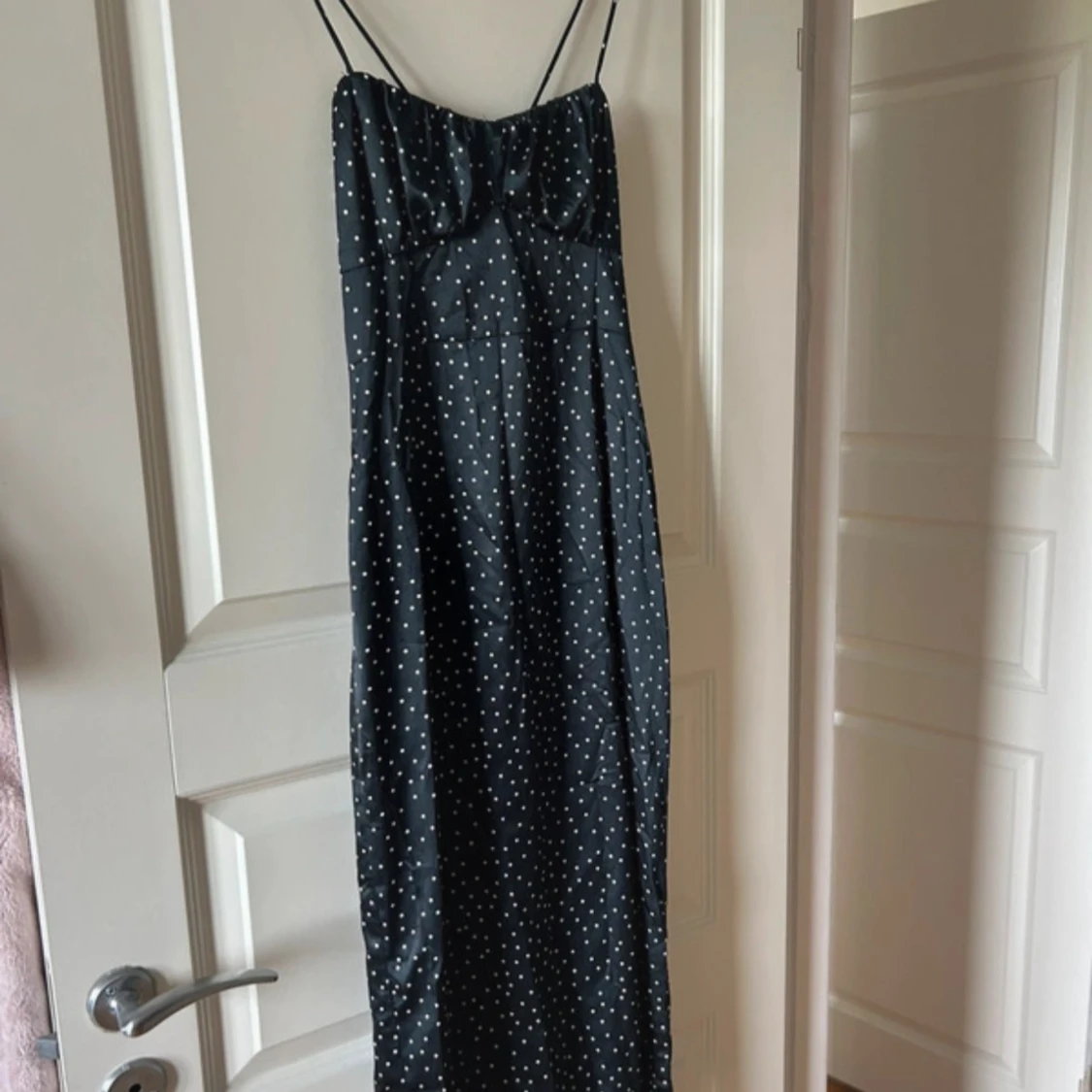 Säljer en svart långklänning med vita prickar och smala axelband. Klänningen har omlottknytning i ryggen och är ärmlös. Perfekt för sommaren.