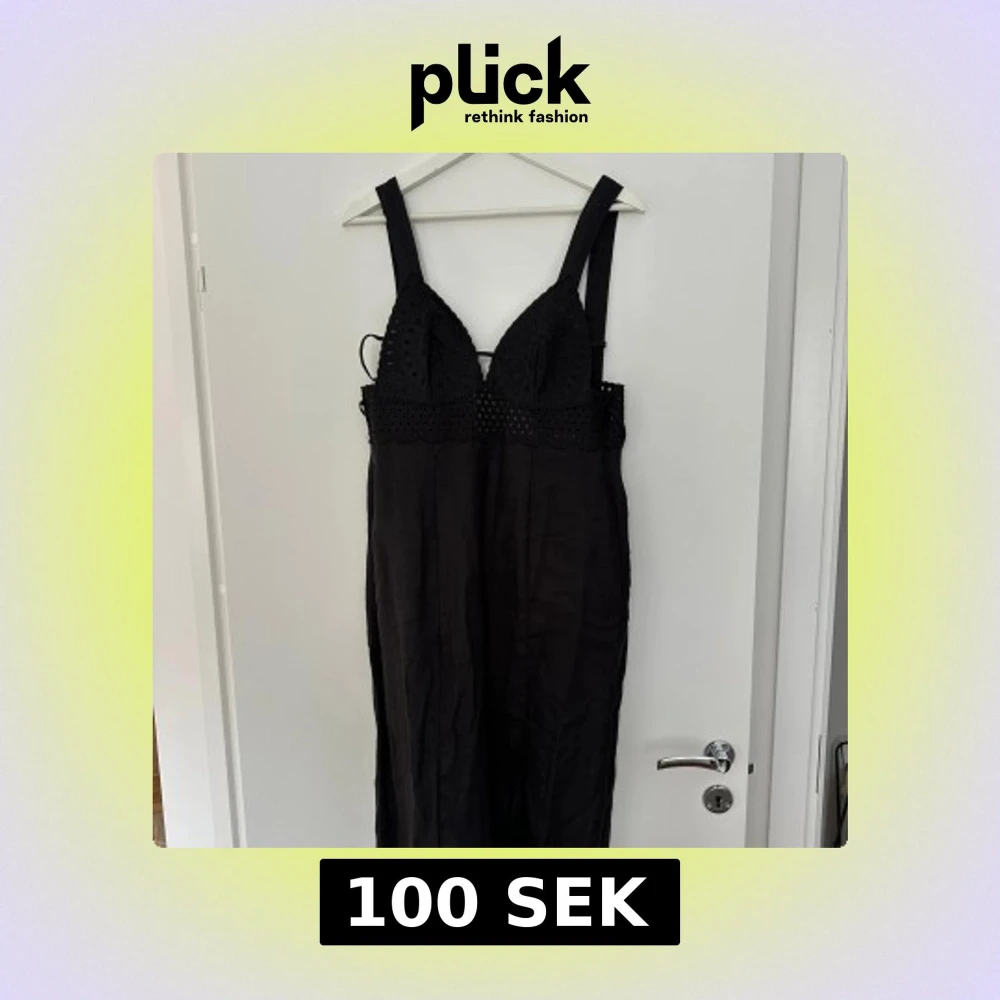 Supersnygg svart klänning i linne från H&M med breda axelband och broderade detaljer upptill. Klänningen har en markerad byst med hålmönster och söt scallopkant. Perfekt för dig som gillar en stilren men ändå unik look.
