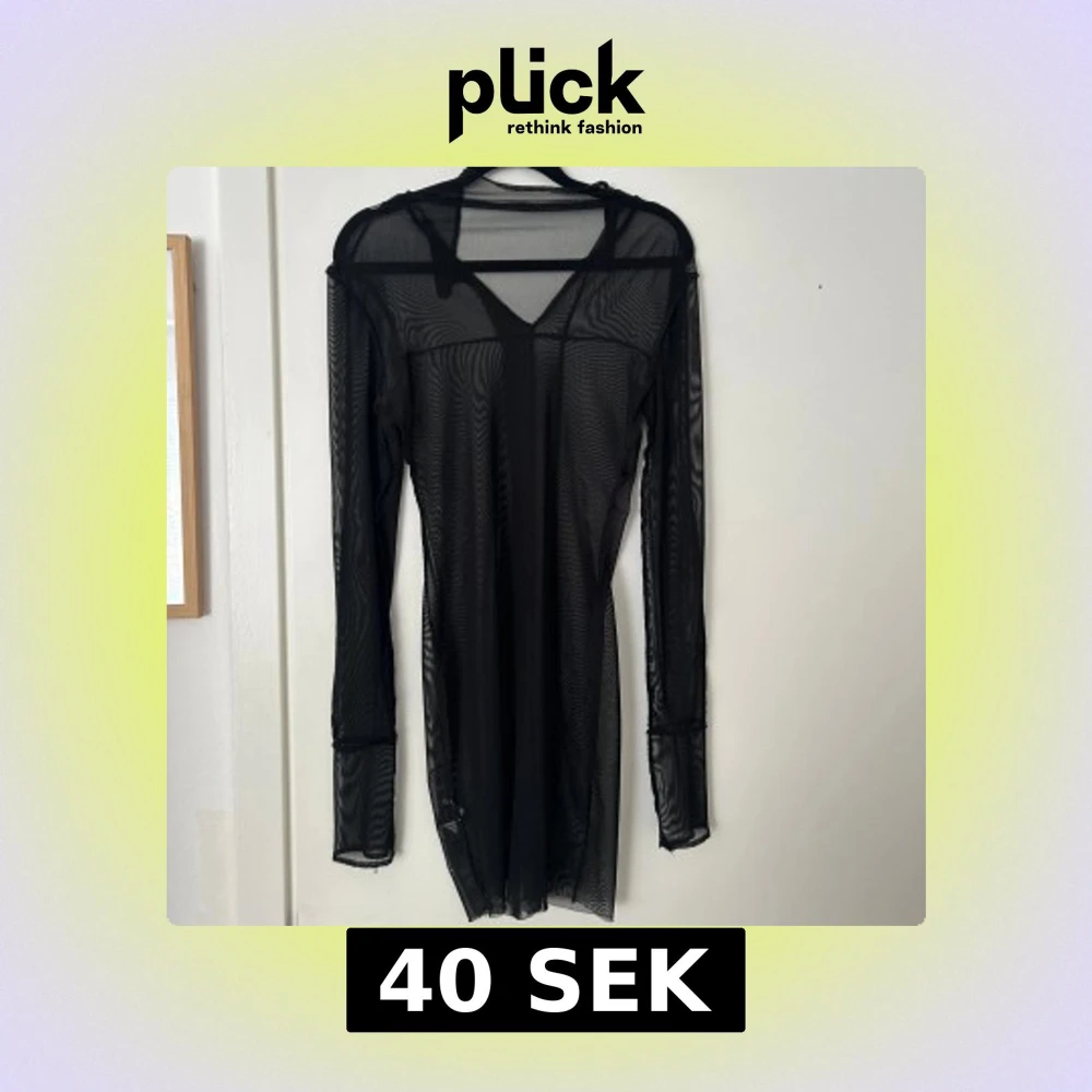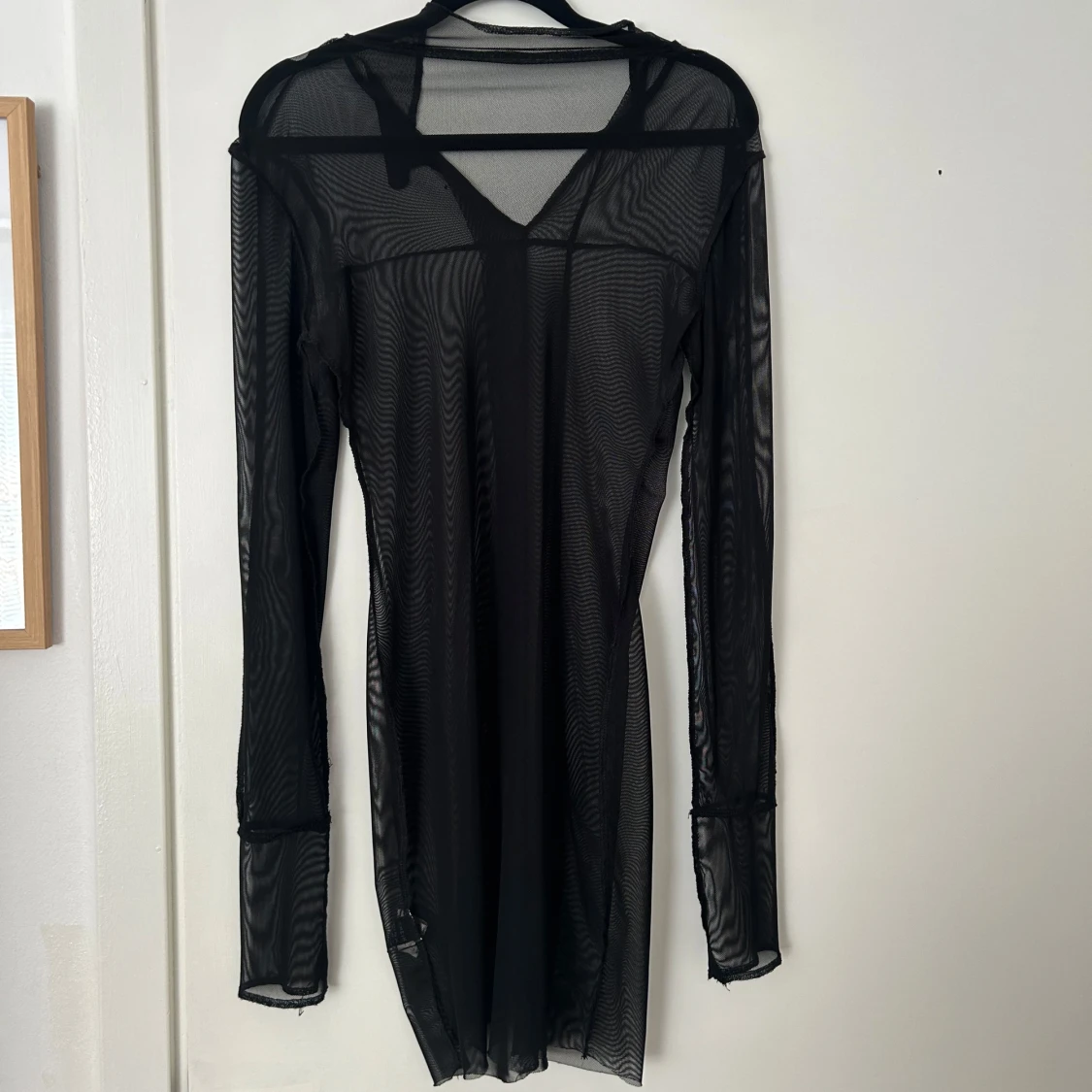 Säljer en svart, transparent meshklänning med lång ärm och v-ringad hals. Klänningen är tight och har en minimalistisk design som passar perfekt för lager-på-lager eller som statement-plagg.